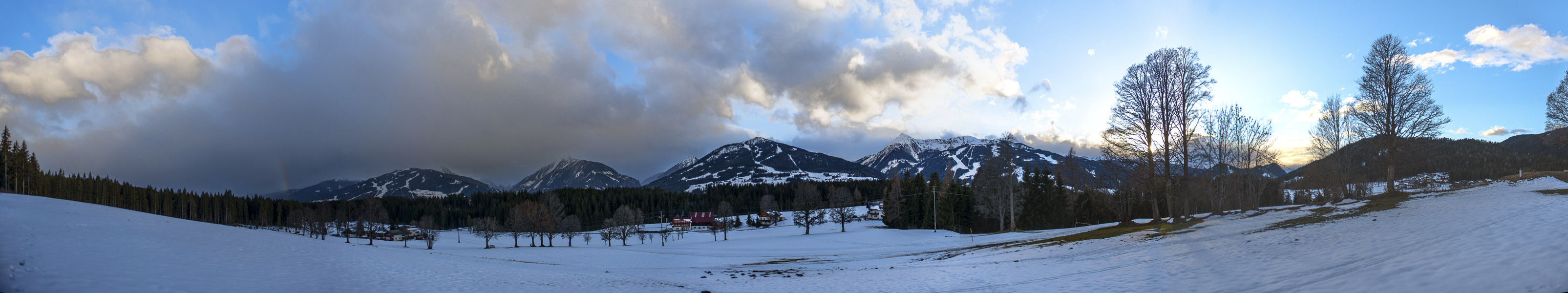 180 Grad - Panoramablick von Ramsau/Vorderberg über das Ennstal zu den von Föhnwolken bedeckten Niederen Tauern.