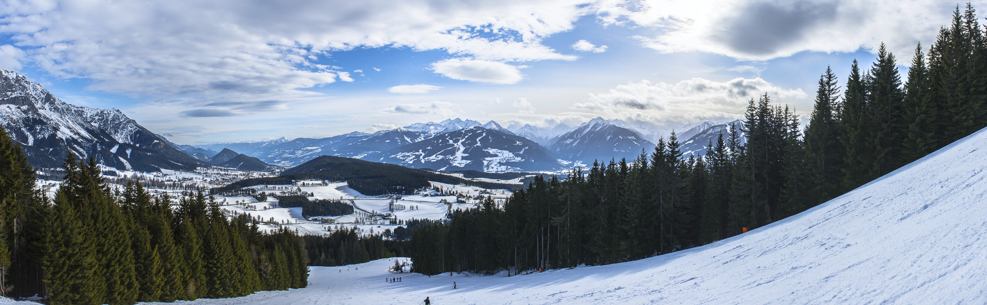 Panoramablick von der Schipiste am Rittisberg über das Ennstal nach Osten und zu den Niederen Tauern nach Süden.