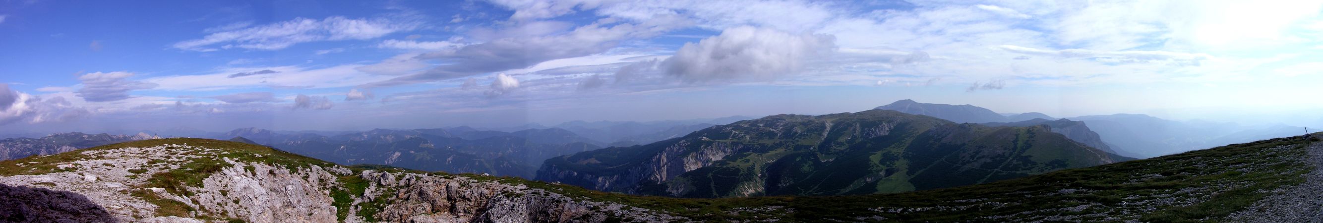 Due to the chapel, the summit panorama must be parted: northern part with further destinations of the tour, Schneeberg behind.