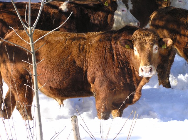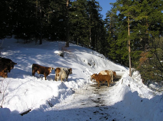 A flock of cows with their calfs, in the snow (delicous young beef is sold by the farmers)