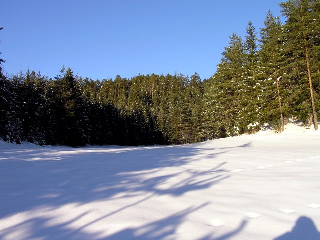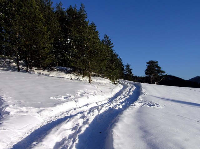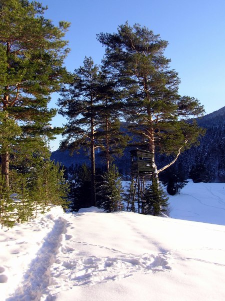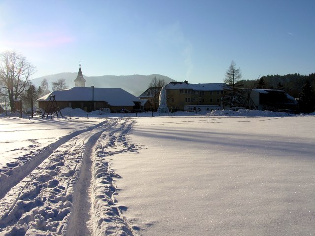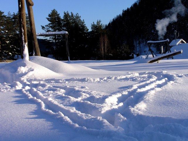 Behind the barn some tractor tracks lead through the deep snow, making possible a little walk