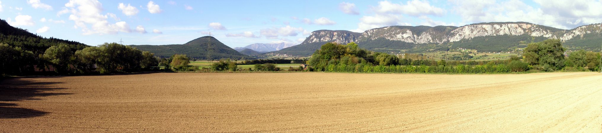 Panoramic view from near Gaaden: from left to right Kienberg, Schneeberg far behind, then Hohe Wand.