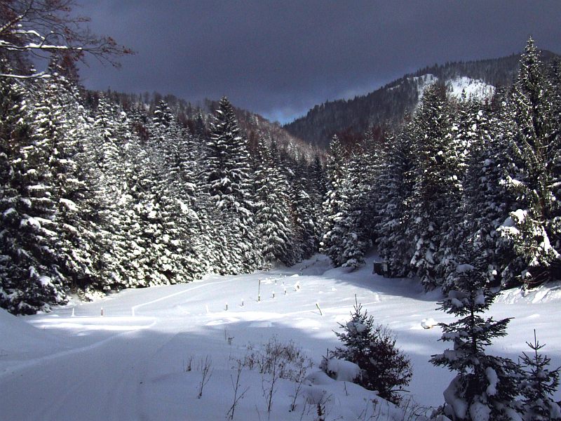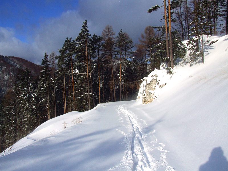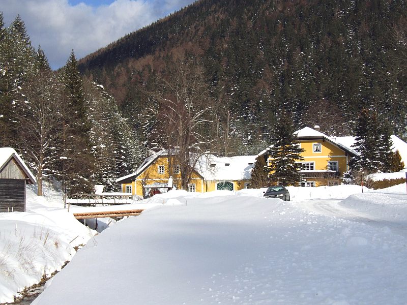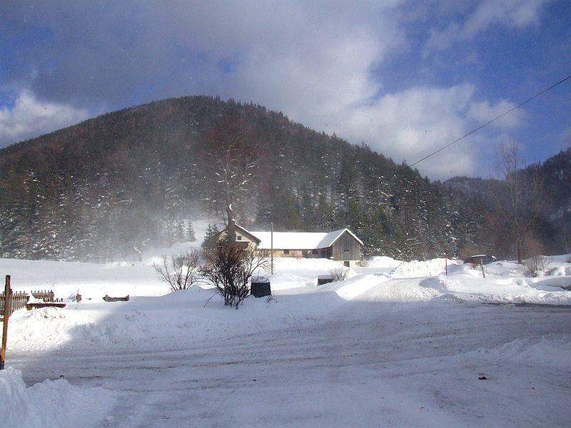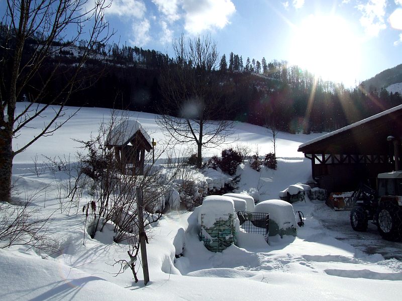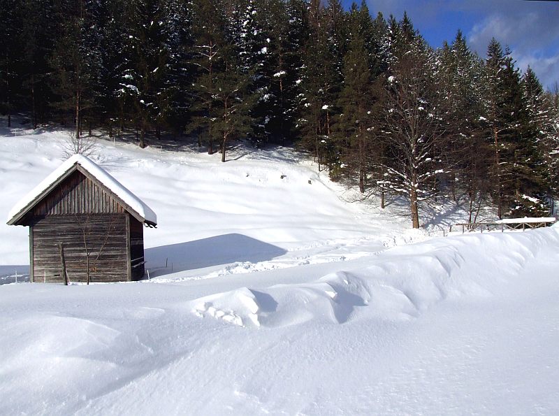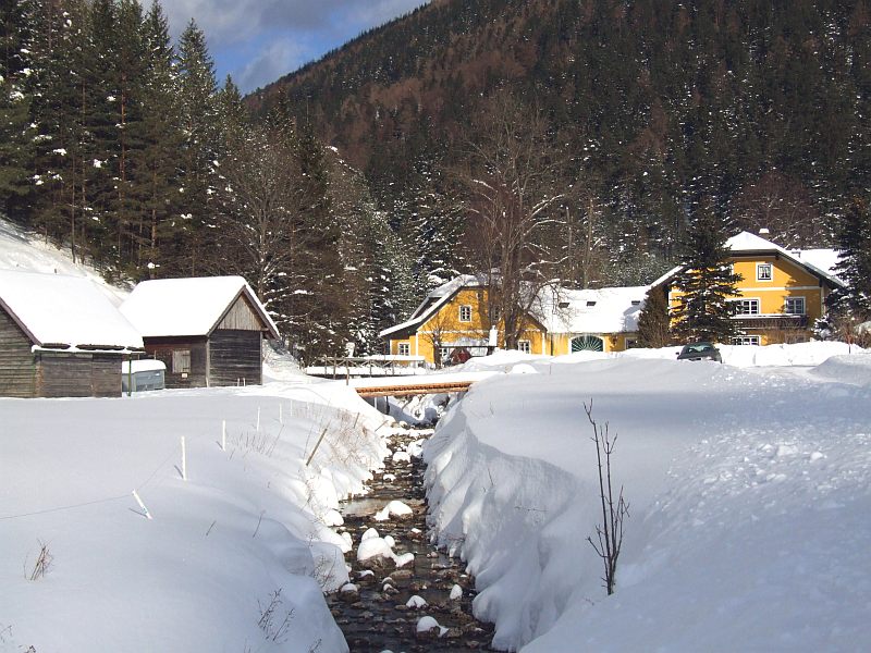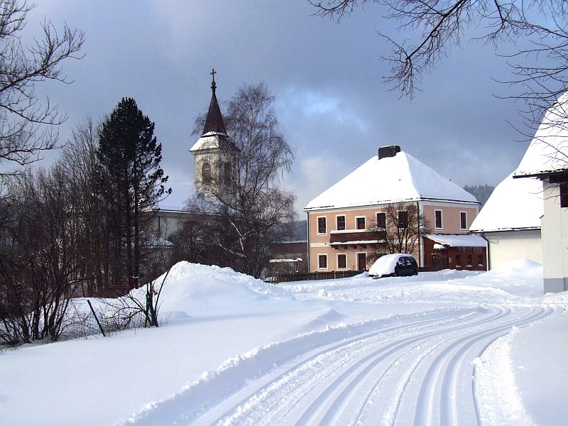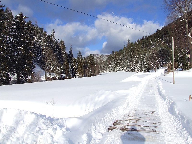Es sind Semesterferien, und die Kinder besuchen einen Schikurs bei den Furtnerliften, 5 km außerhalb von Rohr im Gebirge. Es gibt dort zwei sehr nette Schlepplifte mit auch recht schönen Abfahrten, aber den ganzen Tag nur zwei oder drei Hänge befahren ist auch nur mäßig attraktiv. Ich habe daher auch die Langlaufschi eingepackt und mache mich trotz 15 cm pulverigen Neuschnees mit den kürzeren Adventure - Schi auf den Weg, die Loipe nach Rohr im Gebirge zu erkunden.