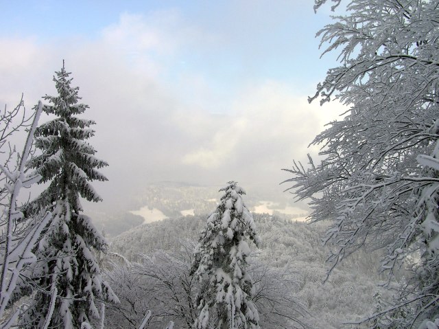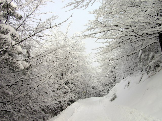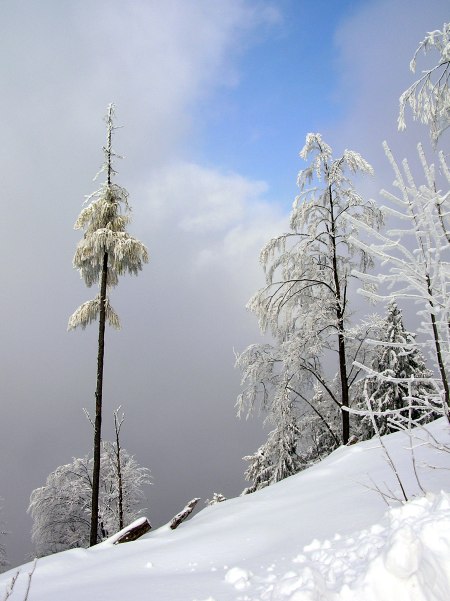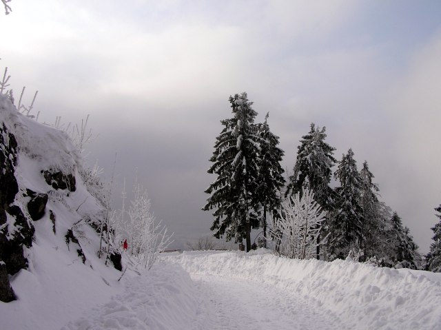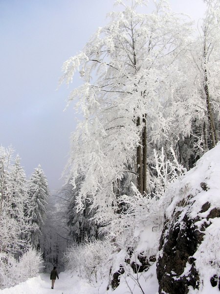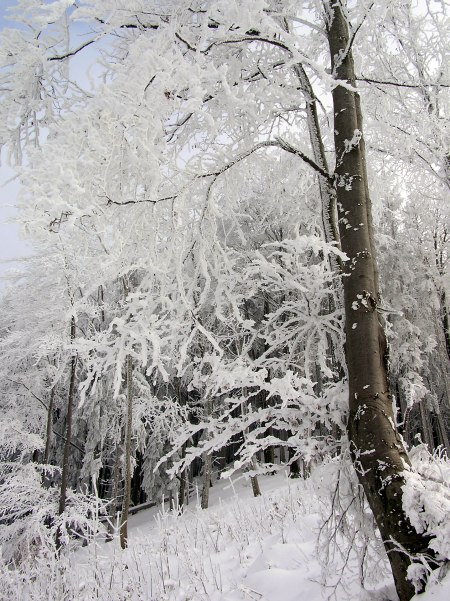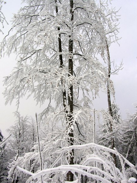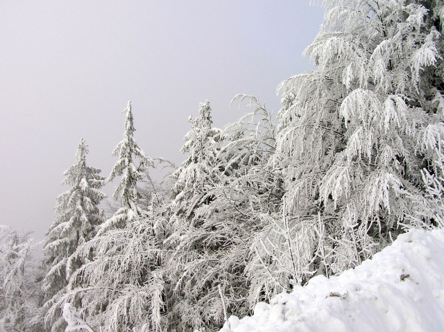 Zum Schnee kommt noch dicker Raureif auf allen Ästen.