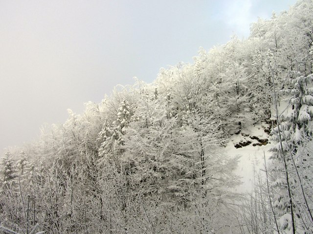 Winterimpressionen vom tief verschneiten Wald. Von Zeit zu Zeit lichtet sich der Hochnebel ein wenig und läßt einige Sonnenstrahlen durch.