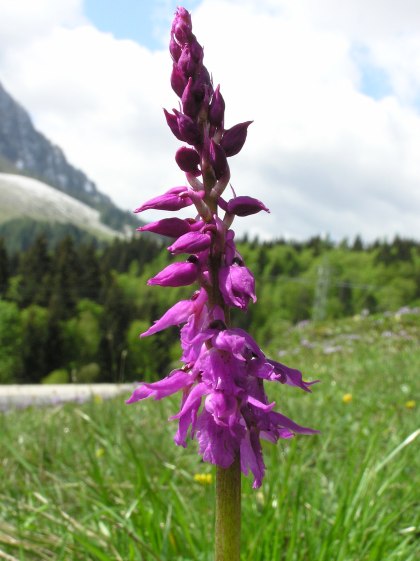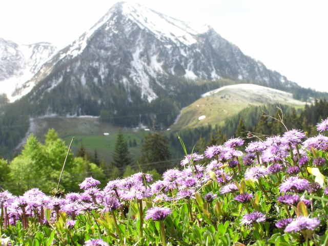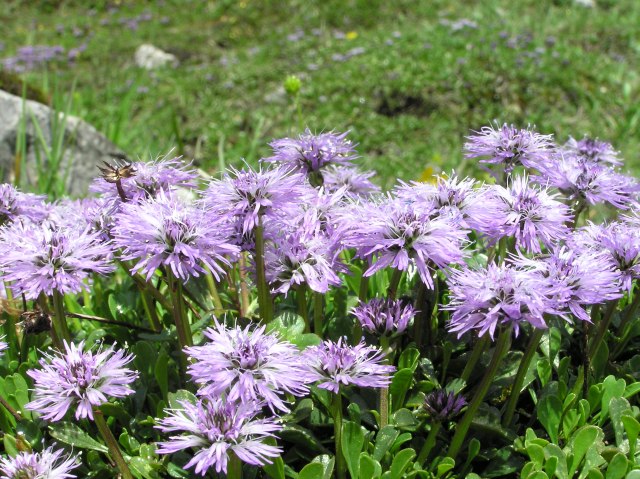 Herzblättrige Kugelblumen (Globularia cordifolia) near the road with view to Braunedlkogel