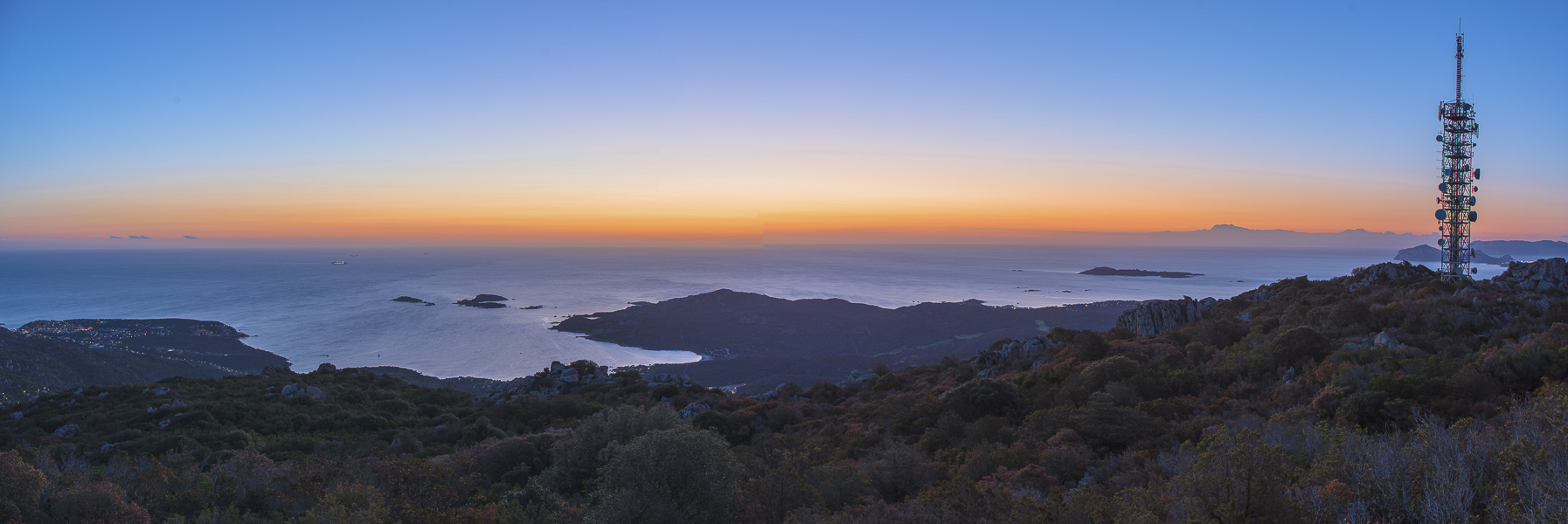 Östliches Morgenpanorama der Costa smeralda, gesehen vom Monte Moro (390 m).