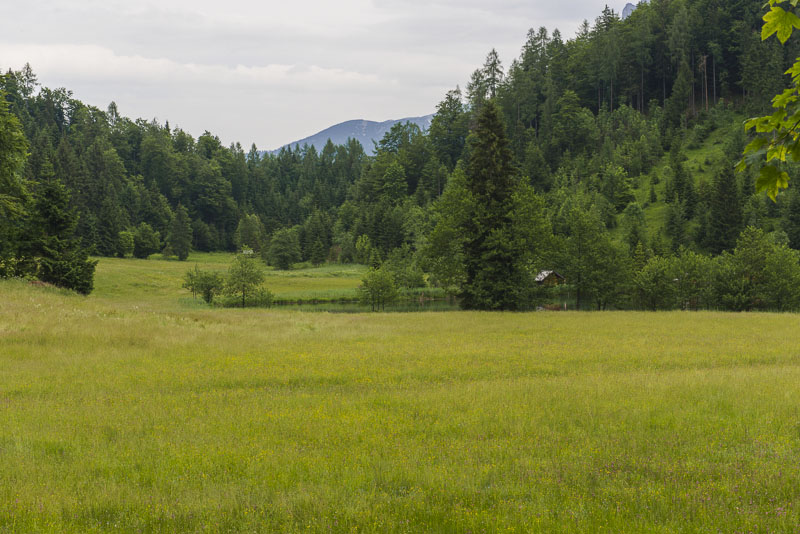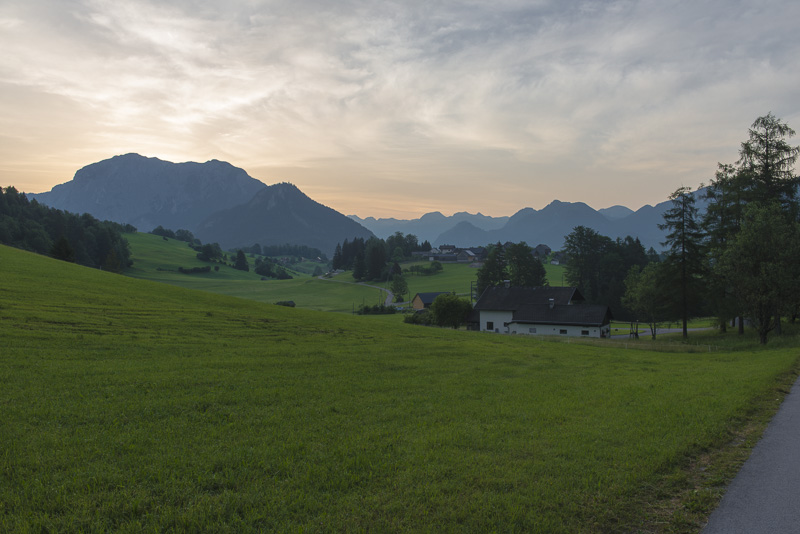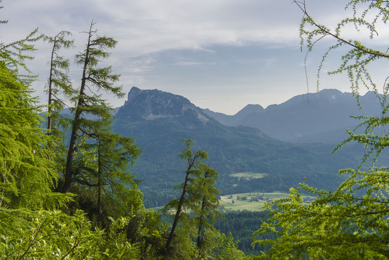 Ich wandere über die große Hochfläche, auf der auch unser Hotel steht. Blick Richtung Grundlsee (hinter den hinteren Häusern verborgen) und Totes Gebirge. Links die Trisselwand (1.754 m) mit dem kegelförmigen Tressenstein (1.201 m) davor.