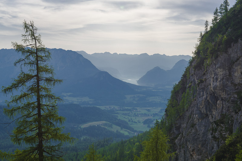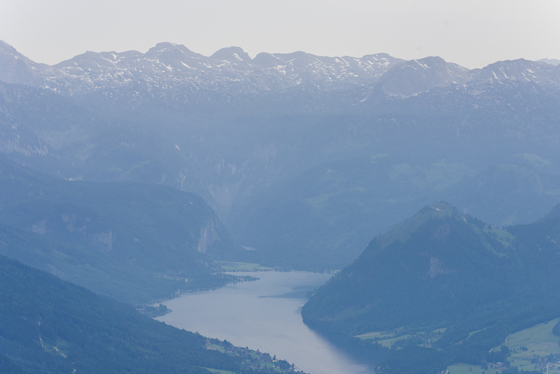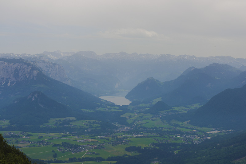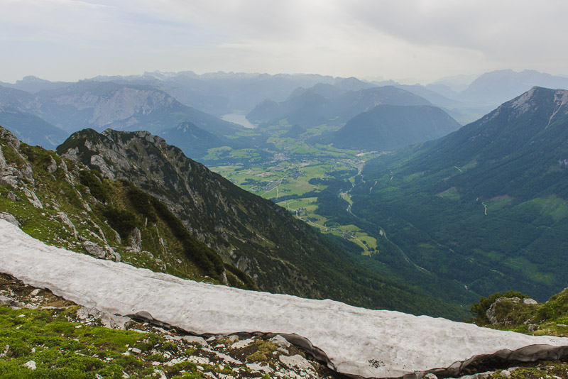 Vom Gipfel sieht man wunderschön hinunter auf Bad Aussee und den Grundlsee. Leider hat sich eine diffuse, hohe Bewölkung eingestellt, und der Grauton ist durch Saharastaub bedingt den es wieder einmal nach Mitteleuropa weht.