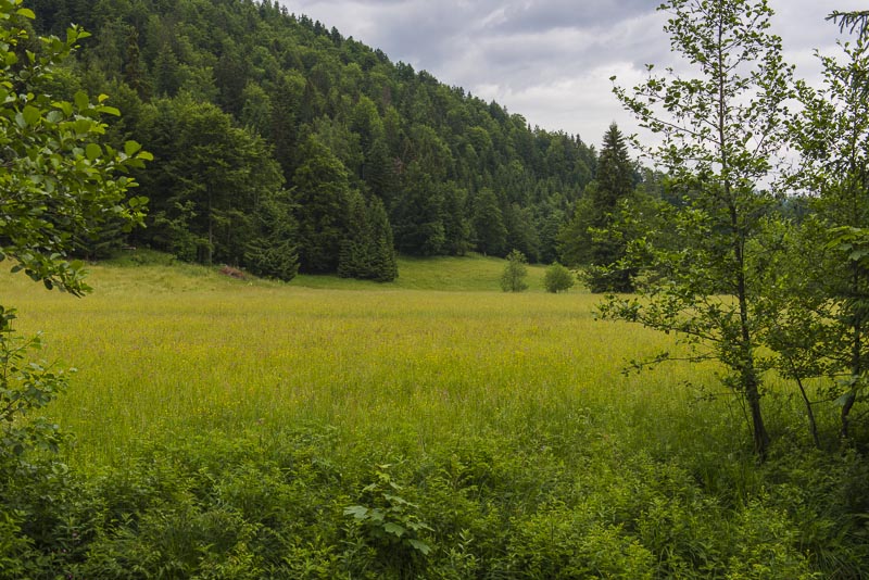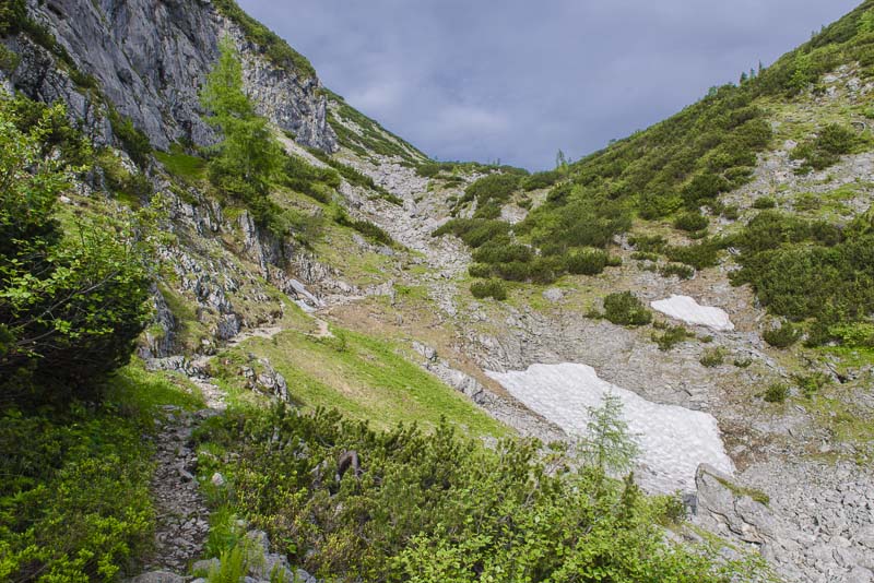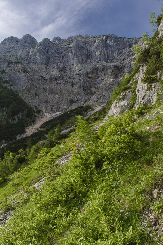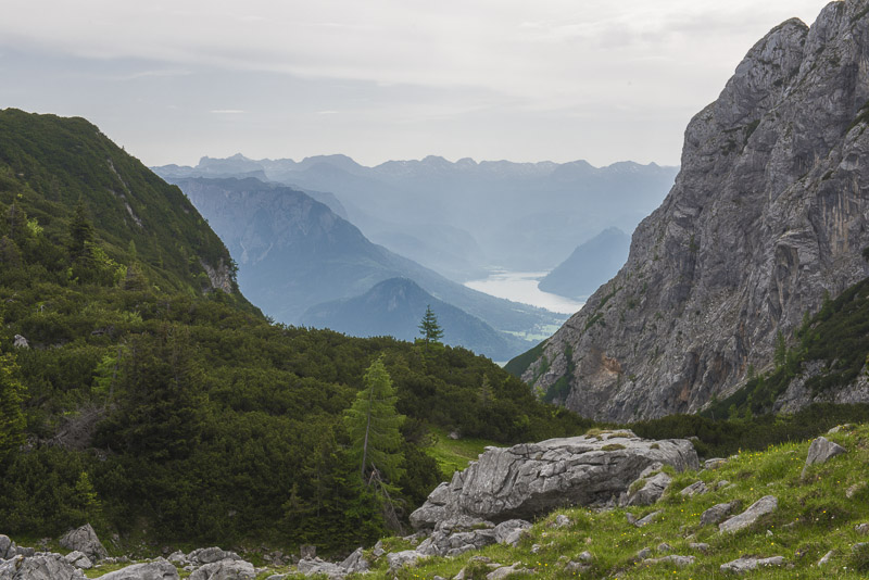 Schon recht hoch oben, hier wird das Gelände steil. Im Hintergrund der Grundlsee.