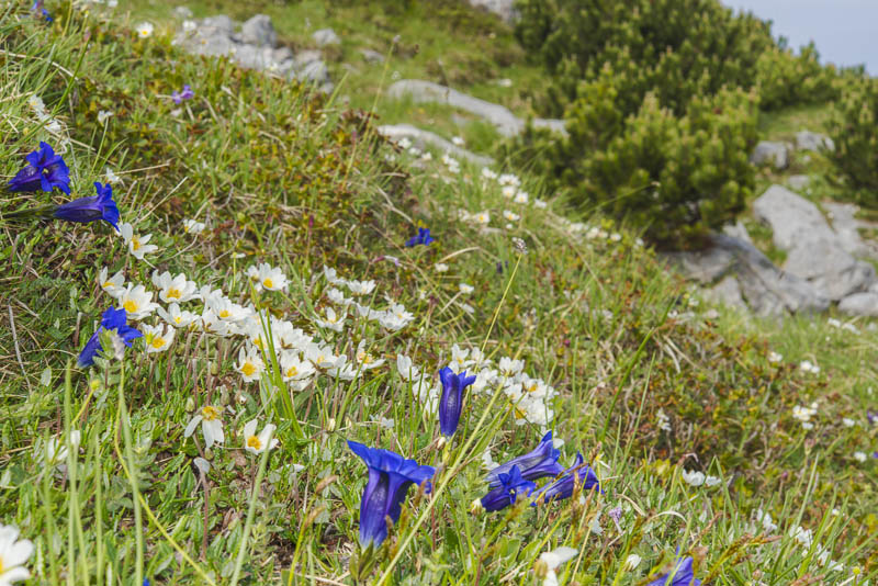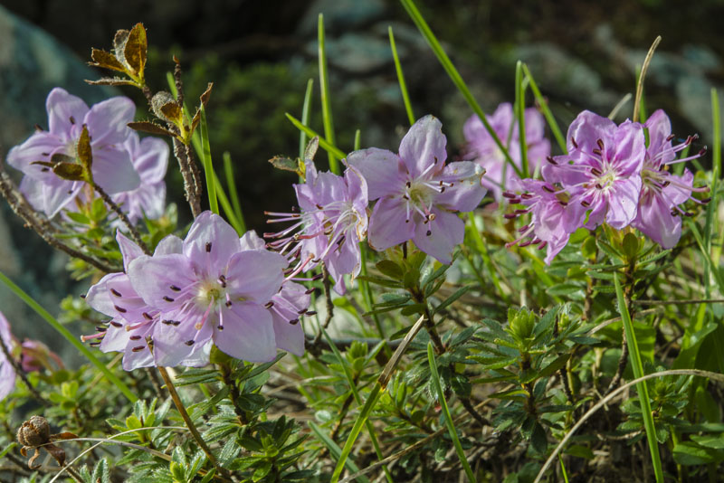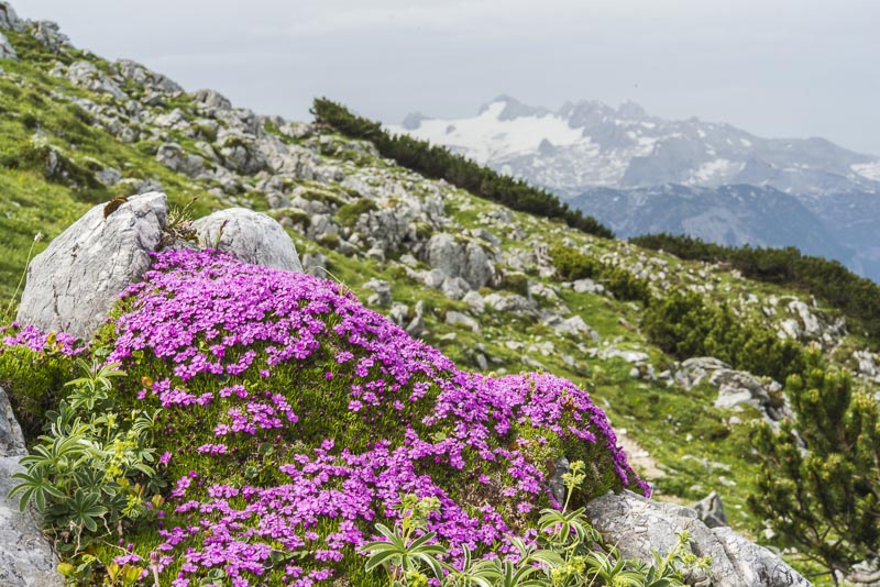 Zwerg - Alpenrosen (Rhodothamnus chamaecistus) blühen neben dem Weg.