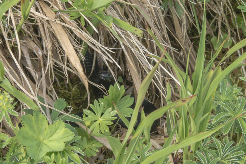 Unter einem Stein eine schwarze Höllenotter (Vipera berus). Sie faucht bedrohlich, wenn ich mich ihrem Ruheplatz nähere.