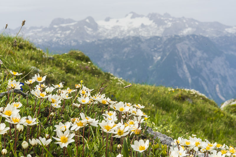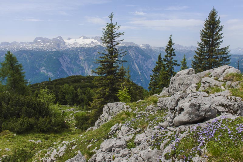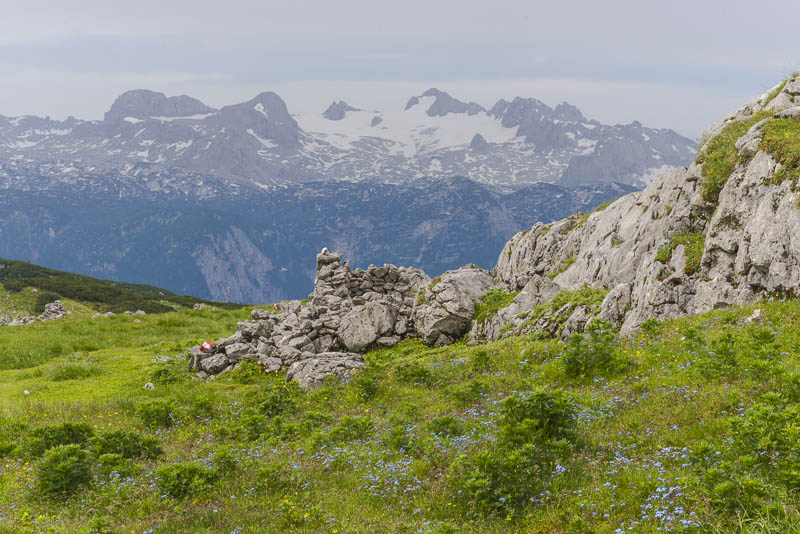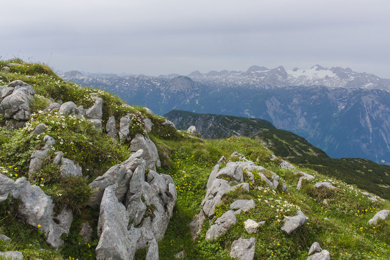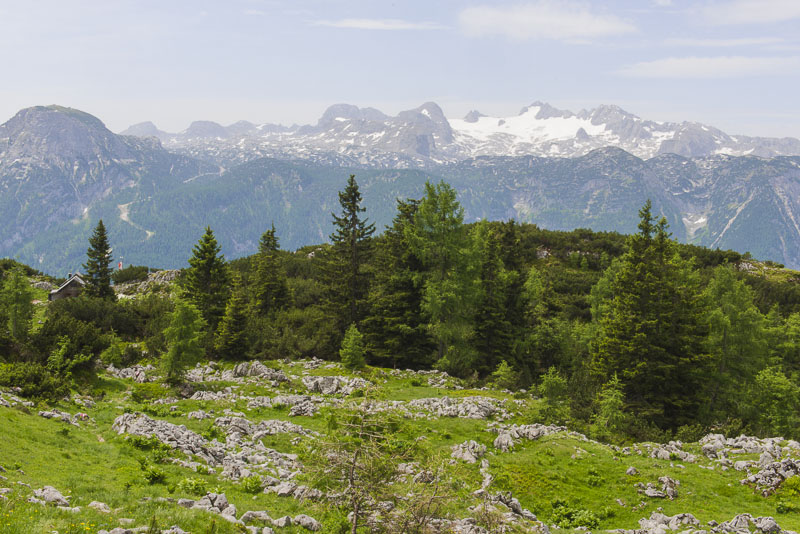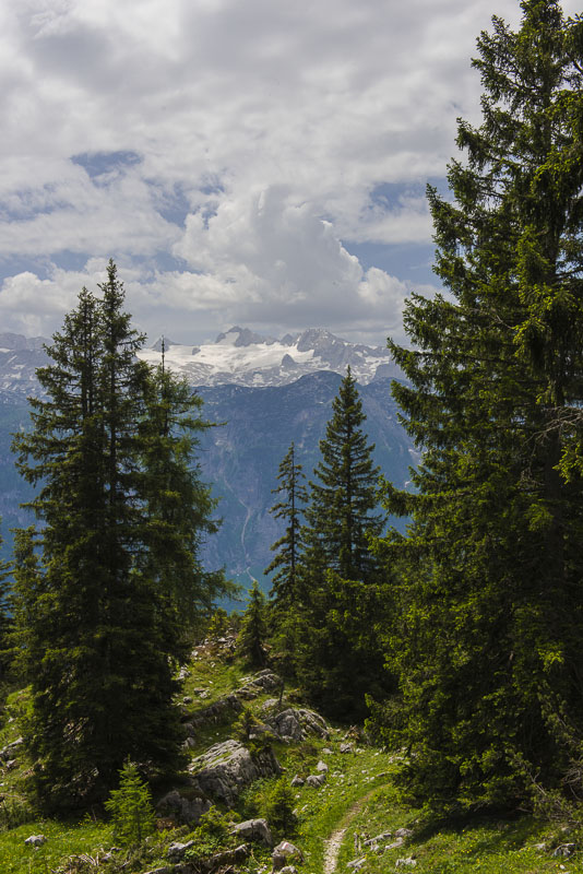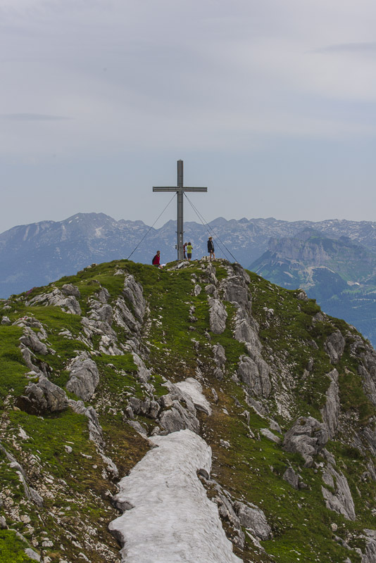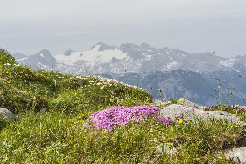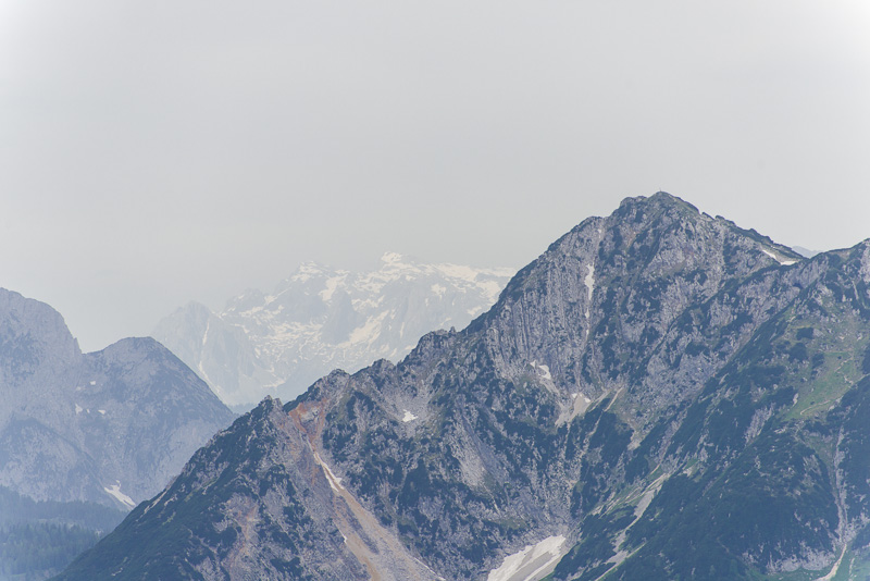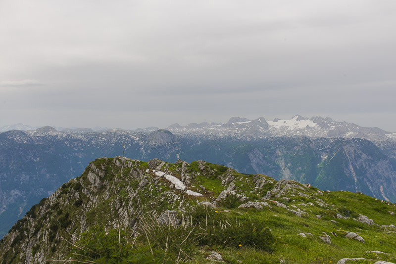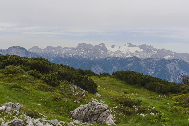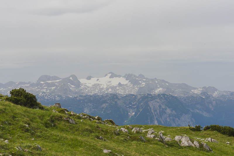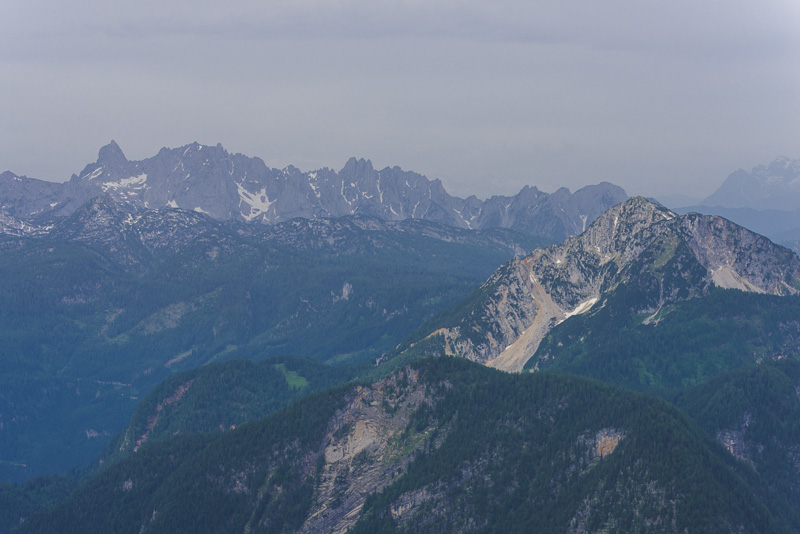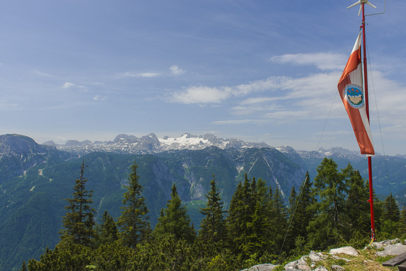 Knapp unterhalb des Gipfels bekomme ich den ersten freien Blick auf das Dachsteinmassiv, das hier ganz nahe ist.