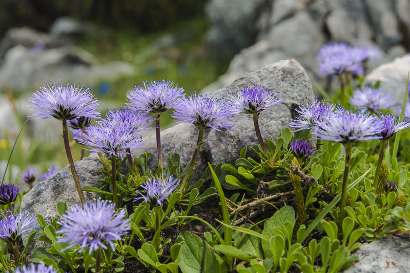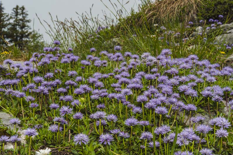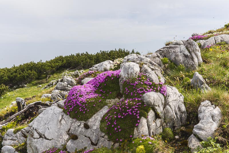 Gegen Ende des Kamms geht´s dann bergab Richtung Obertraun. Wunderschöne große Flecken mit blühenden Kugelblumen (Globularia cordifolia)