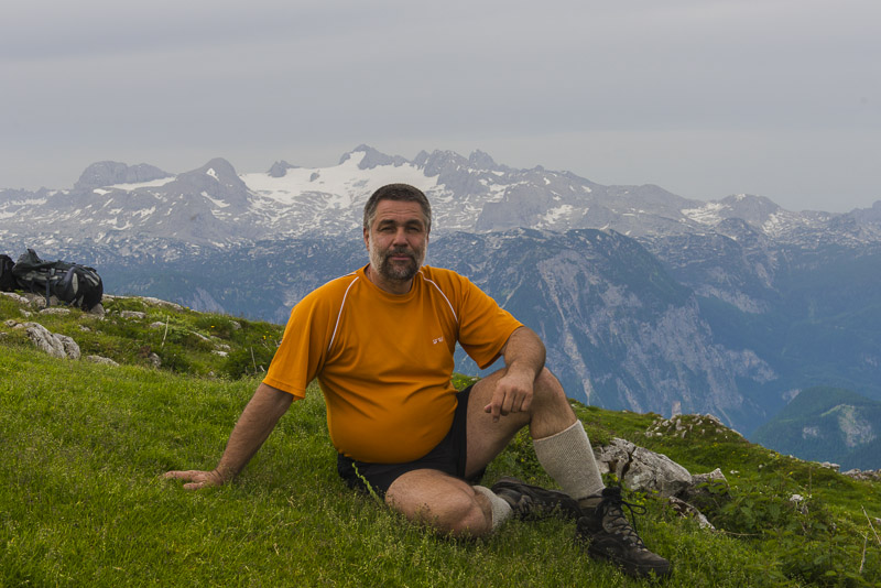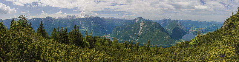 Der Hüttenwirt führt mich einen kurzen unmarkierten Steig zu einem noch besseren Aussichtspunkt, von dem aus man nicht nur den Dachstein, sondern auch Hallstatt ...