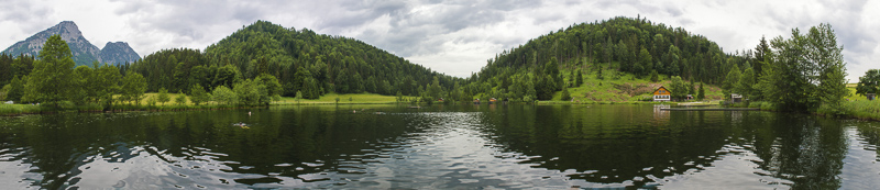 Hier baden Leute trotz des etwas bewölkten Himmels. Panoramabild vom Sommersbergsee, vom Badesteg aus aufgenommen. Hierher oder ins Bild klicken für eine größere Darstellung.