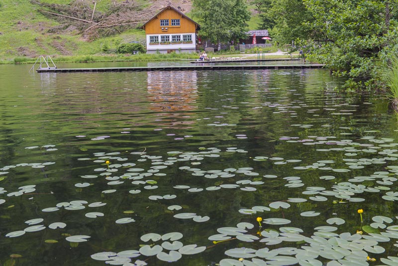 14.6.2015: Nachdem wir zu Mittag aus dem Hotel ausgecheckt haben, fahren wir noch einen Sprung zu dem idyllischen kleinen See, den ich bei meiner Wanderung nur am Rand, quasi im Vorbeigehen, wahrgenommen habe: den Sommersbergsee, ein Moorsee oberhalb von Bad Aussee.