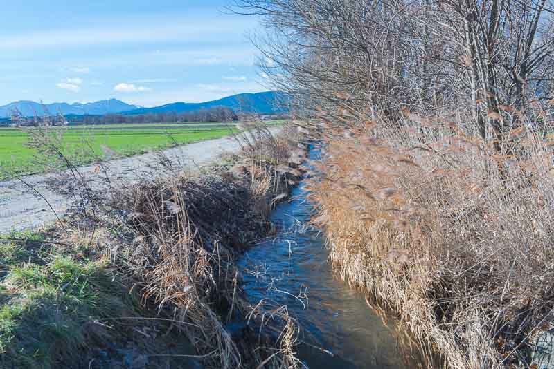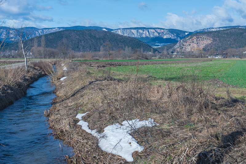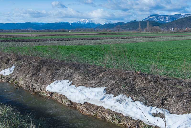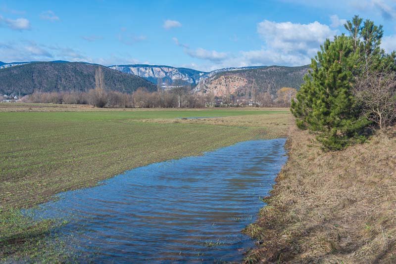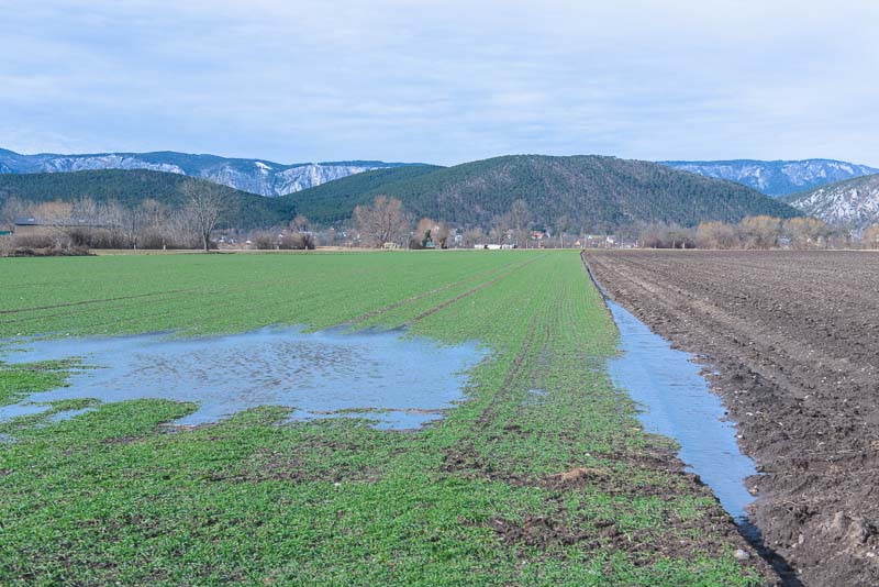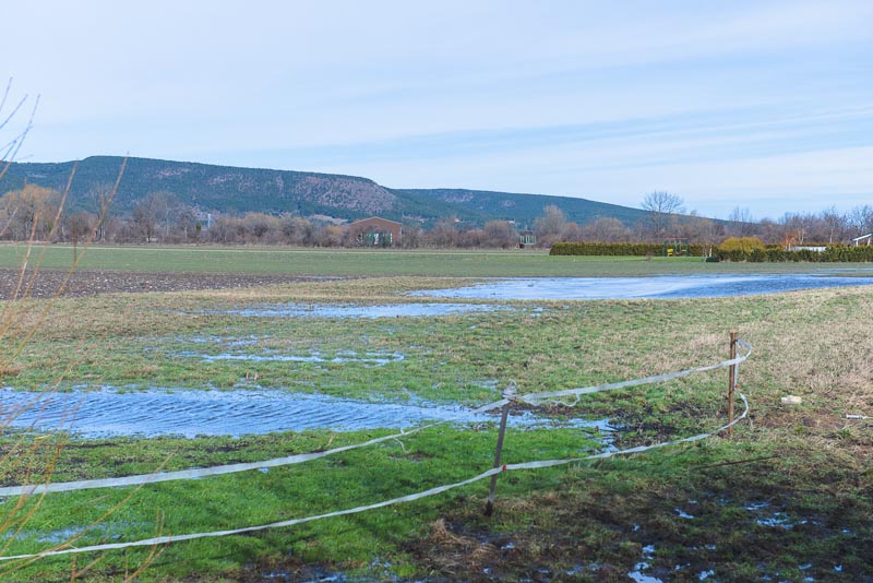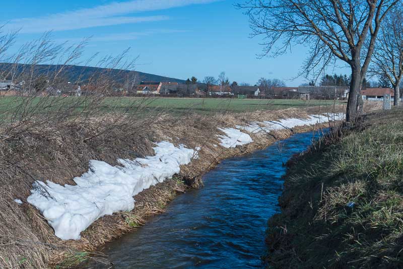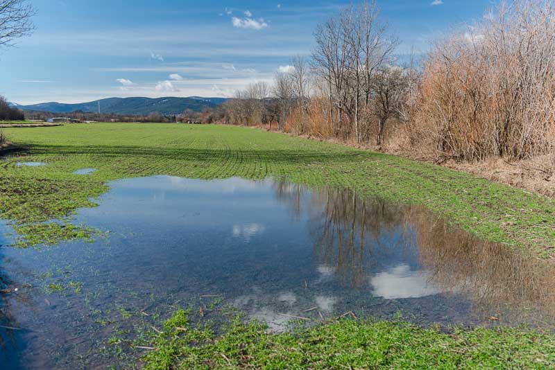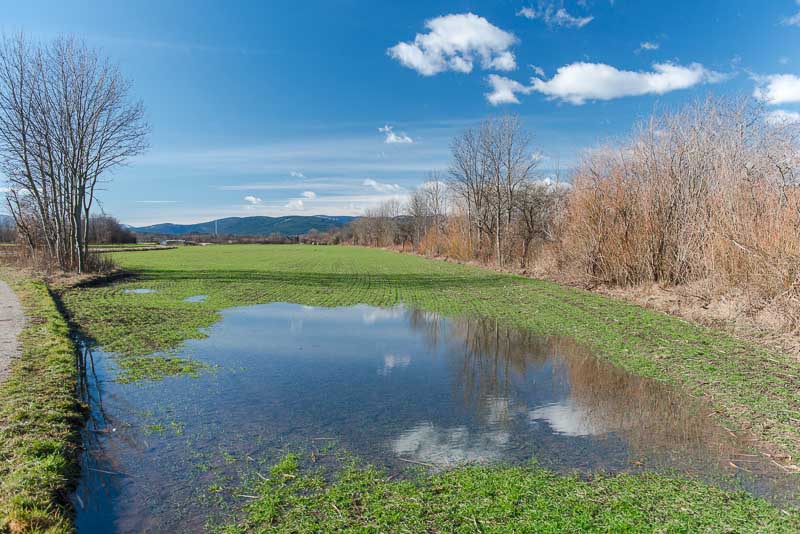 Große Lacken auf den Feldern: das viele Wasser kann nicht so schnell abfließen oder versickern, vor allem wenn der Boden noch in tieferen Schichten gefroren ist.
