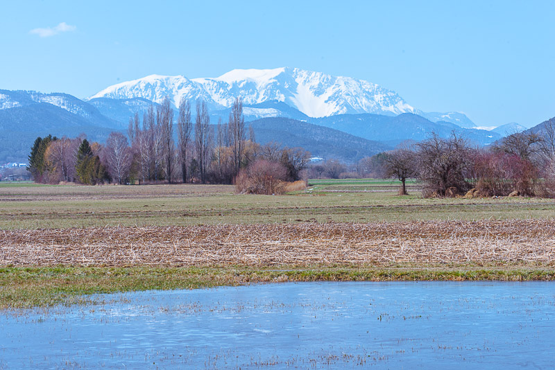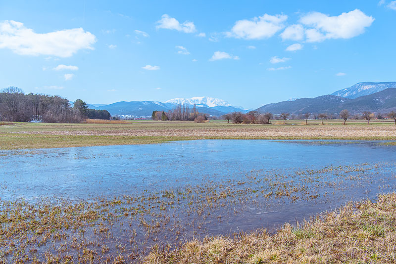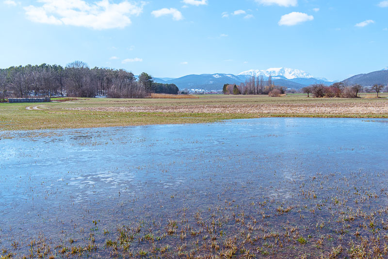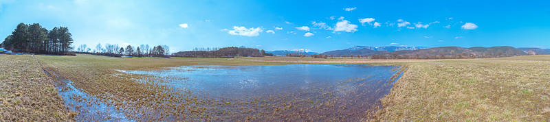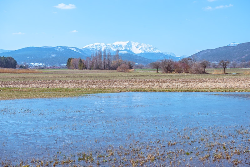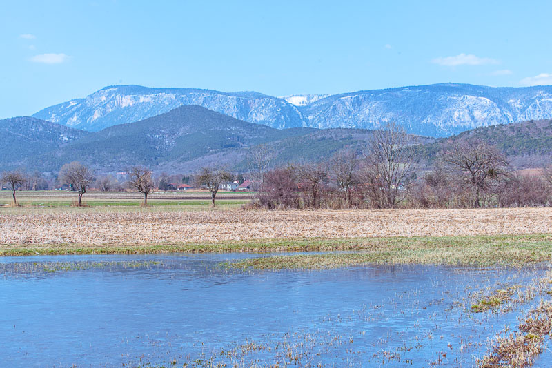 Panoramic picture of the large puddle, with Schneeberg and Hohe Wand in behind. Click here or into the picture for a larger display.
