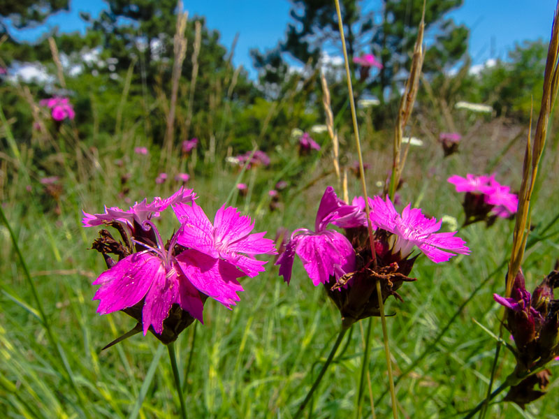 Carthusian Pink (Dianthus carthusianorum) on a small patch of forest and dry grass between the fields..