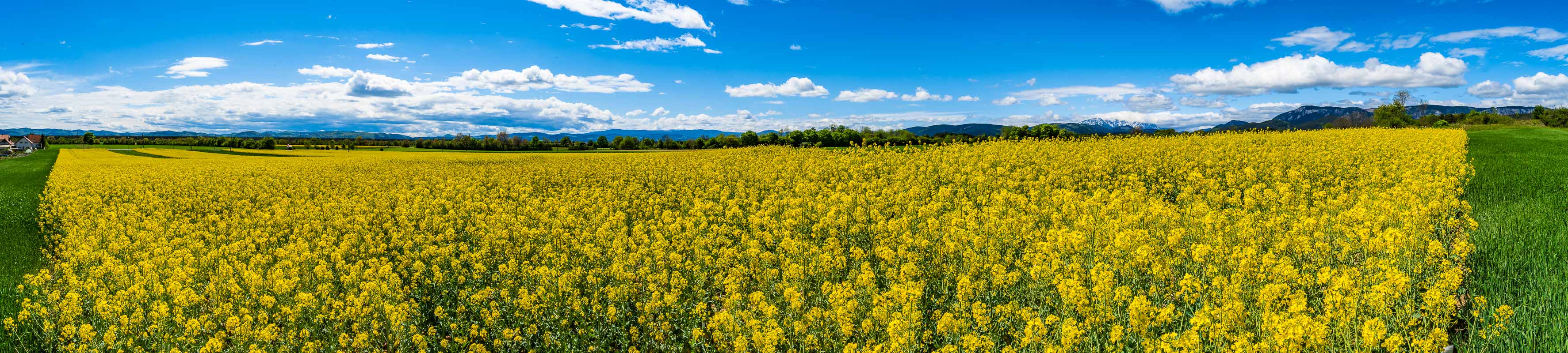 Rapsfeldpanorama mit Blick zu Rosalia, Wechsel, Schneeberg, Hohe Wand.