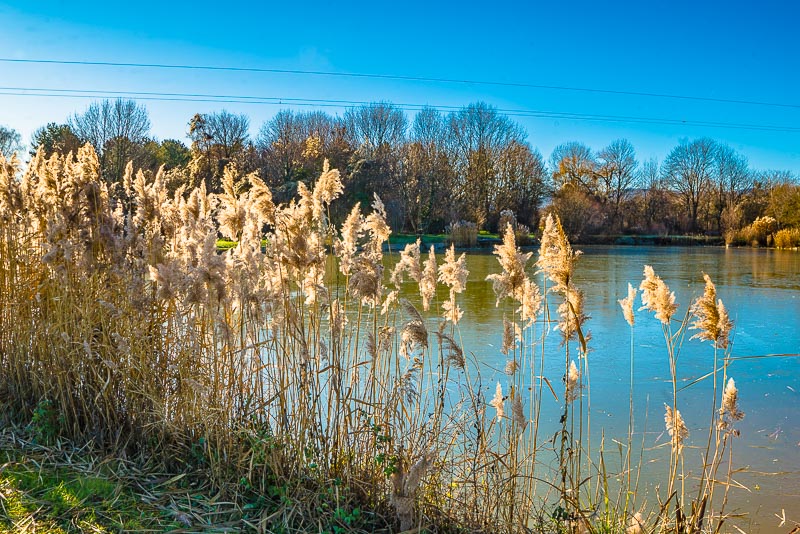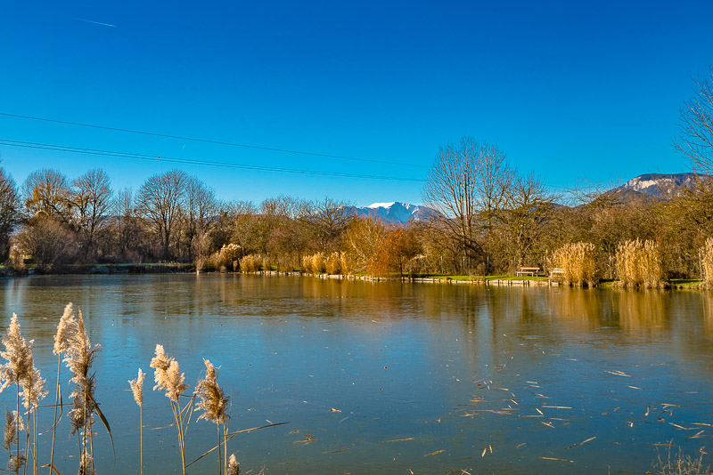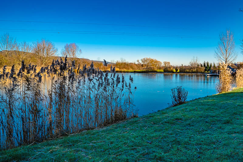 Raureif auf der Wiese im Schatten, und eine dünne Eisschicht auf dem Wasser.
