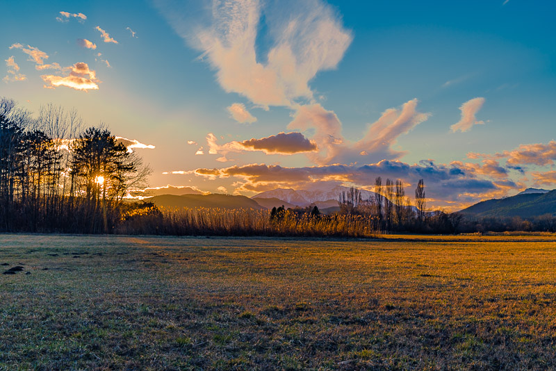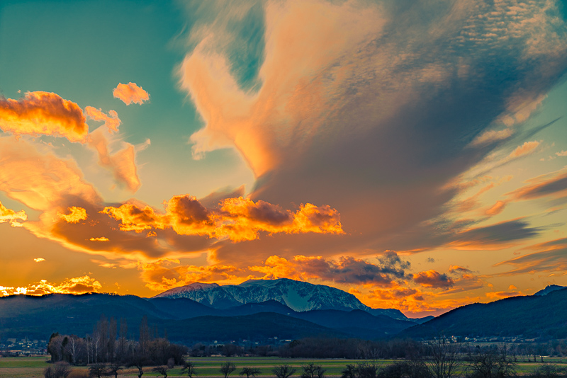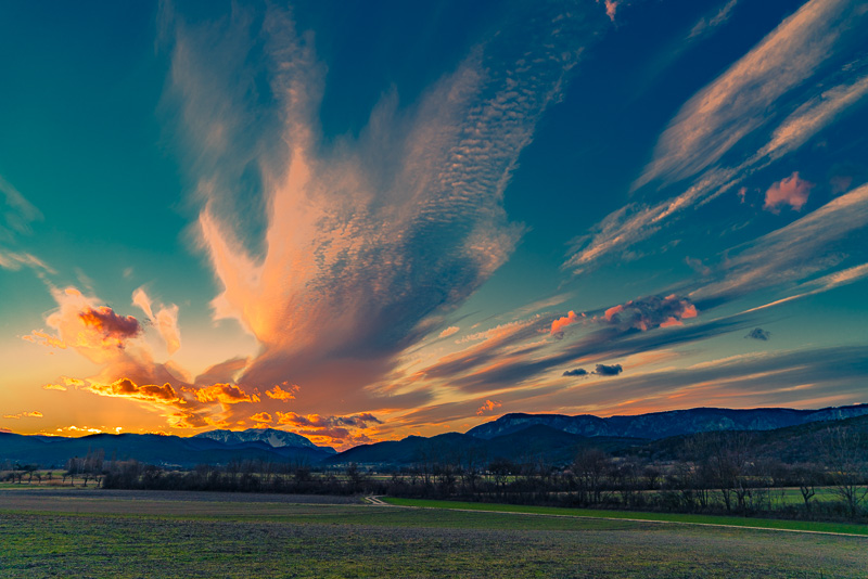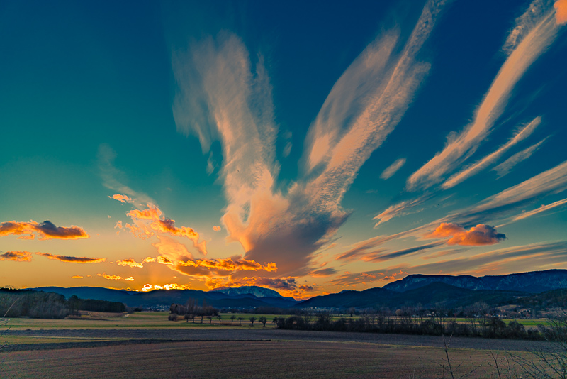 In the loast evening light, the very high clouds are illuminated by the sinking sun from beneath ...