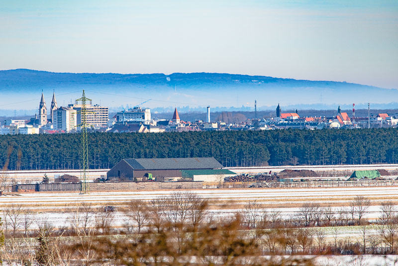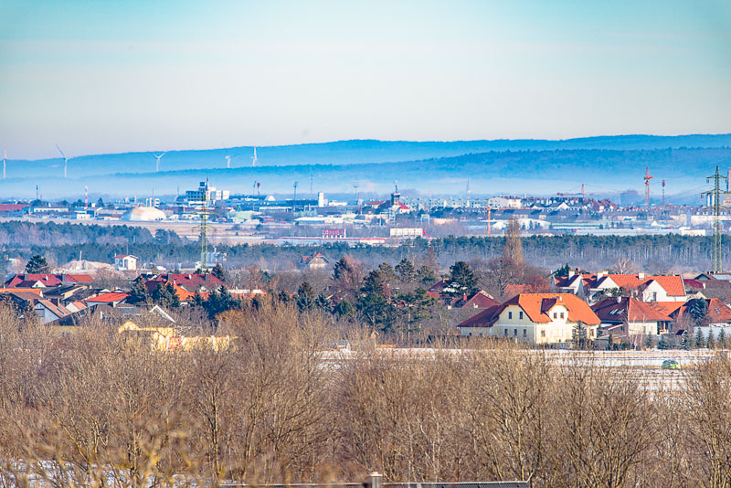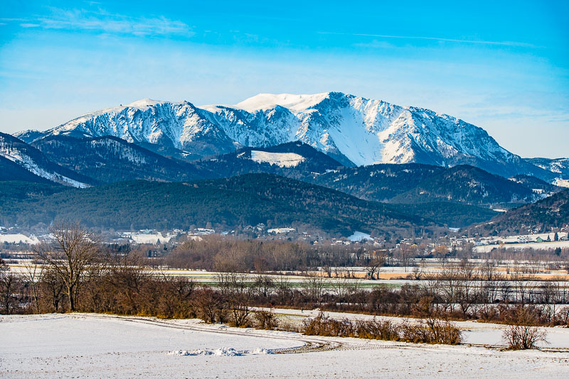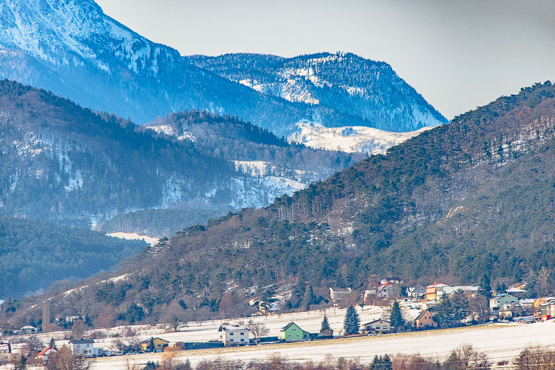 Eine interessante Perspektive: Willendorf, der Fadensattel und der Kuhschneeberg.