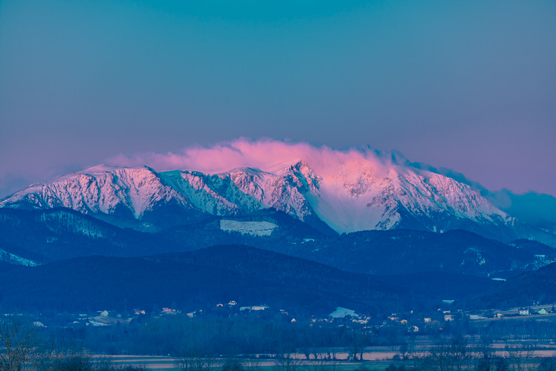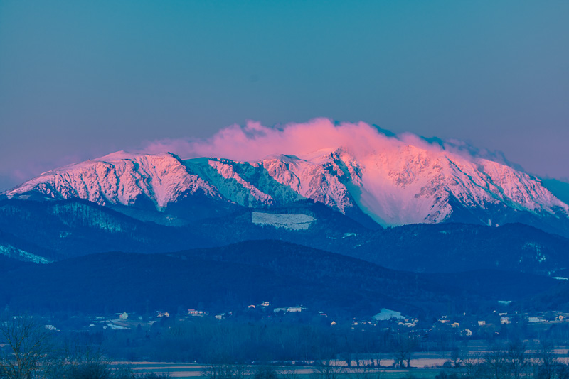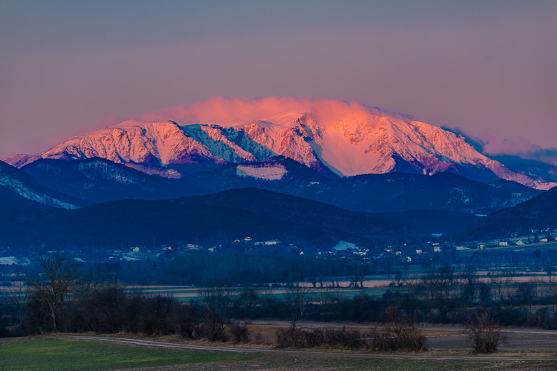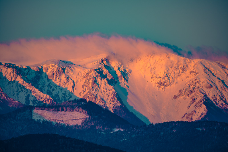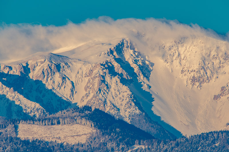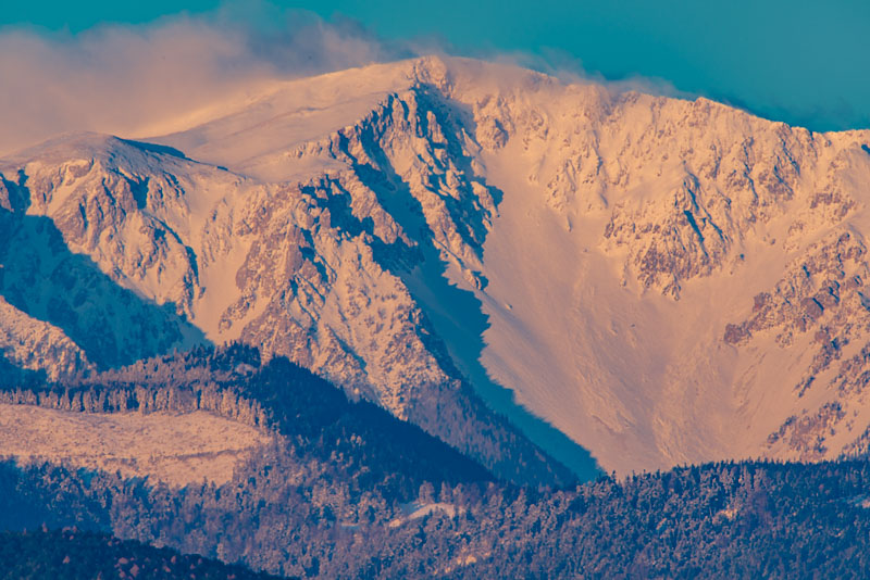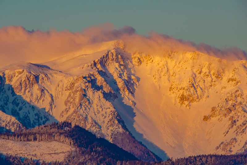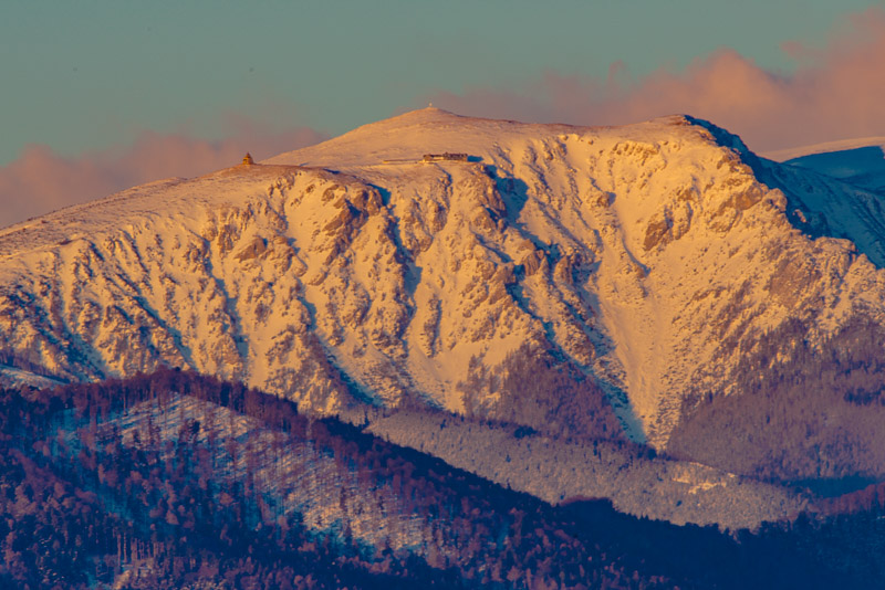 Schnell Stativ aufgebaut und Teleobjektiv dran, und los geht´s mit den ersten Sonnenstrahlen am Schneeberg-Gipfel.