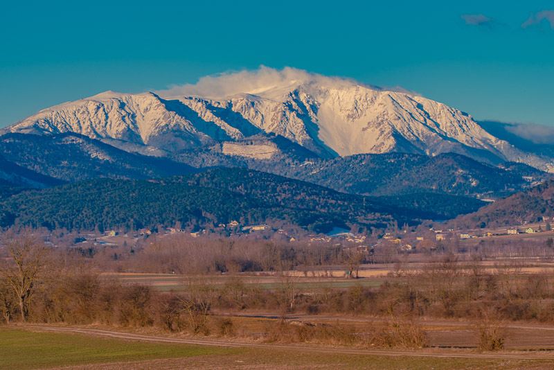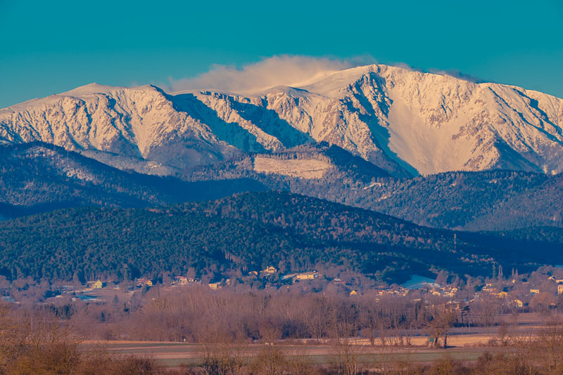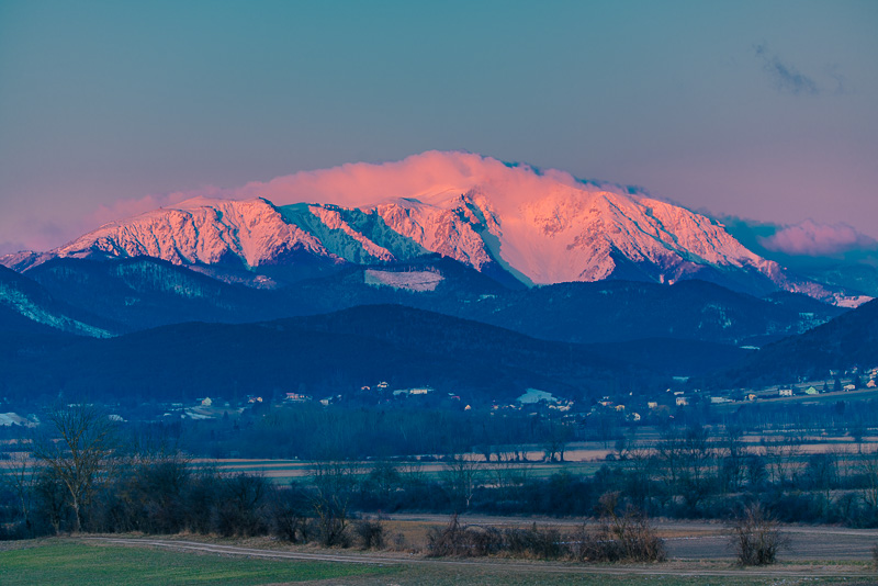 Die Hohe Wand mit dem Sender am höchsten Punkt, der Plackles. Direkt vor dem Sender der Kienberg, der höchste Gipfel der Fischauer Berge.