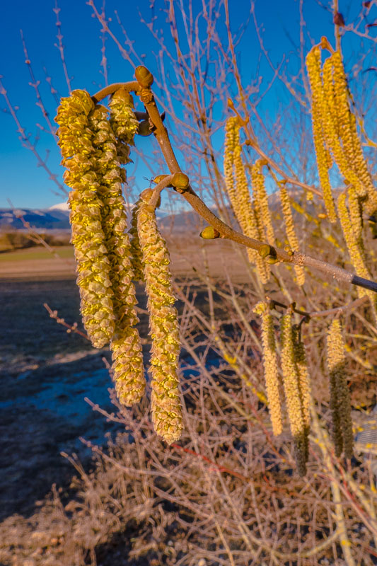 Vom Tauwetter der letzten Woche hängen schon Blütenkätzchen auf den Haselnußsträuchern.