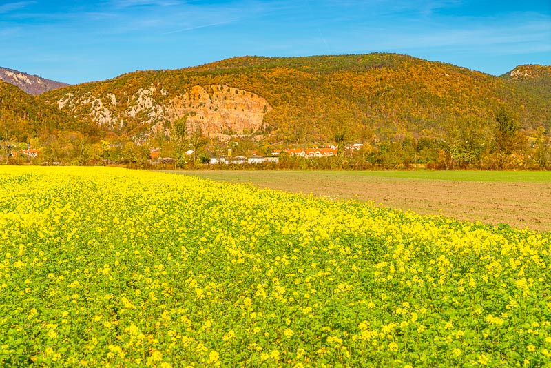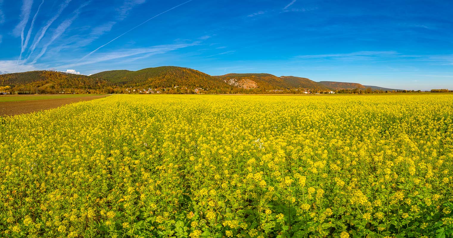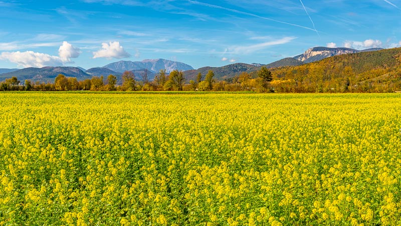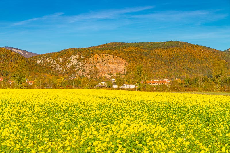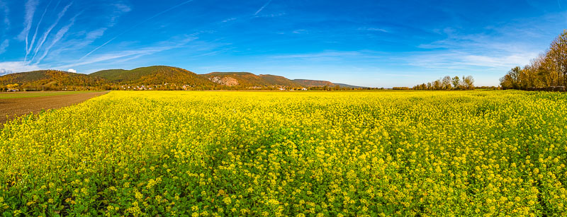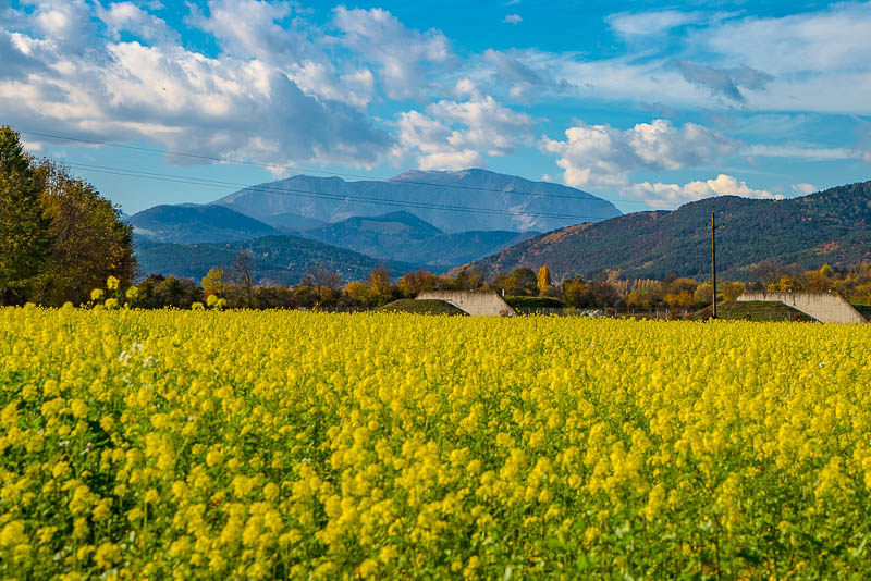 First yellow oilseed rape- (or mustard seed-?) fields are greeting over to the road.