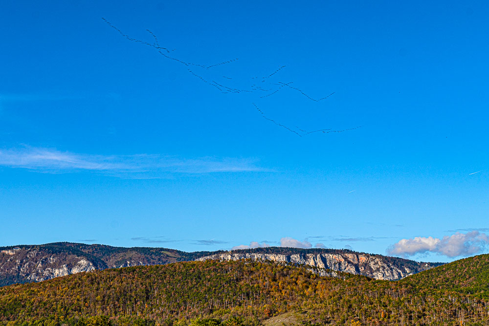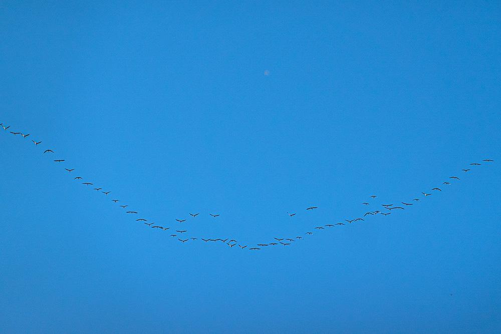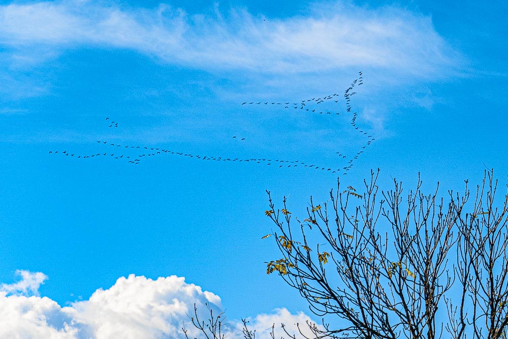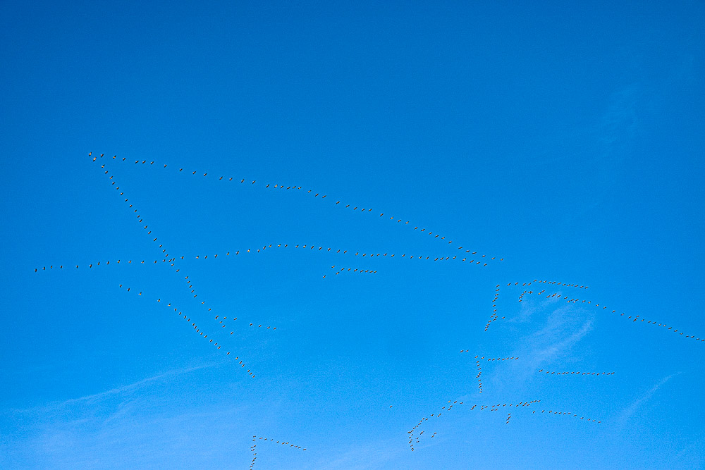 Heute sind Gänse (oder Kraniche?) unterwegs, jeweils in großer Formation.