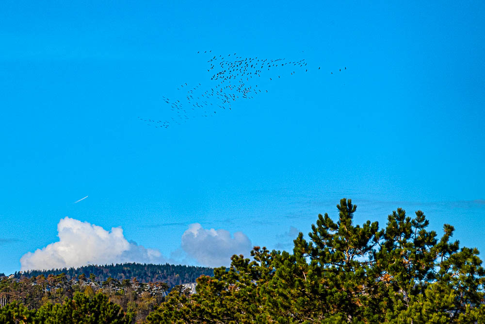 Bei diesem sehr großen Schwarm kann ich beobachten, wie sie über der Hohen Wand mehrere Male im Kreis fliegen - offenbar nutzt der ganze Schwarm die Thermik, um an Höhe zu gewinnen.