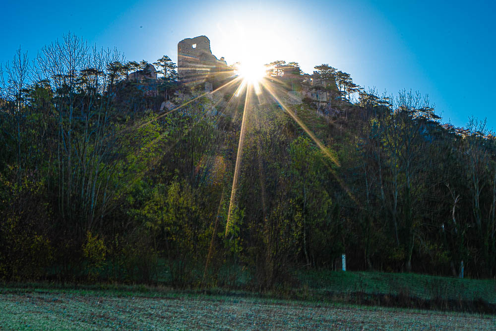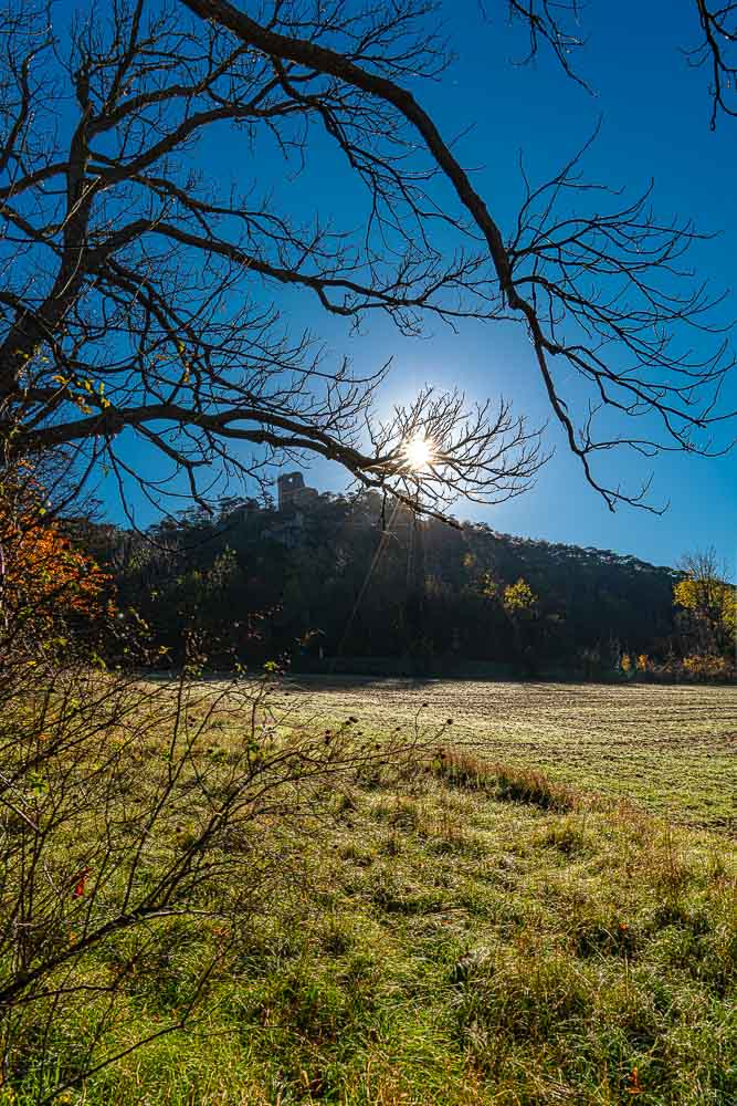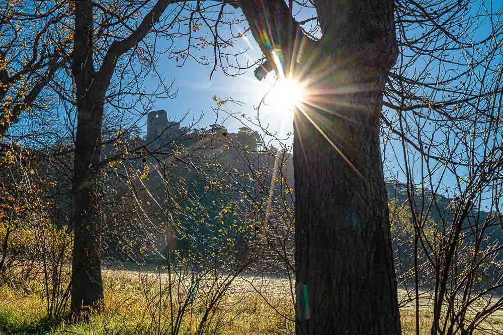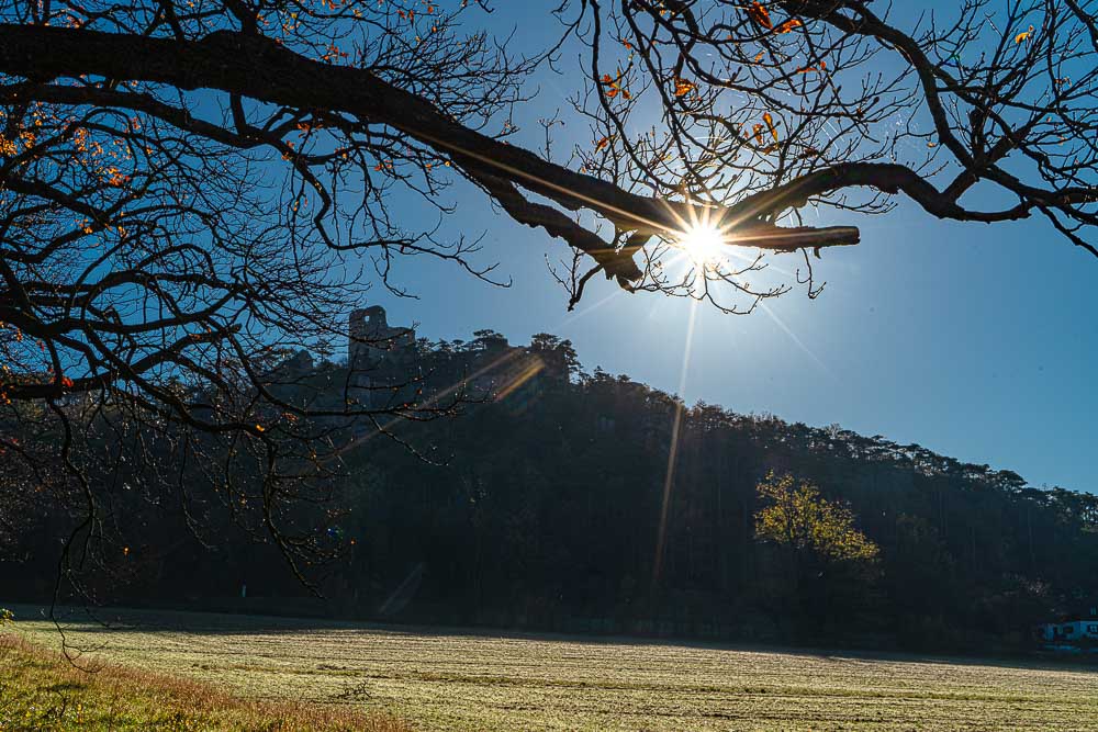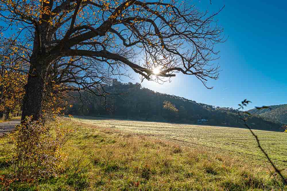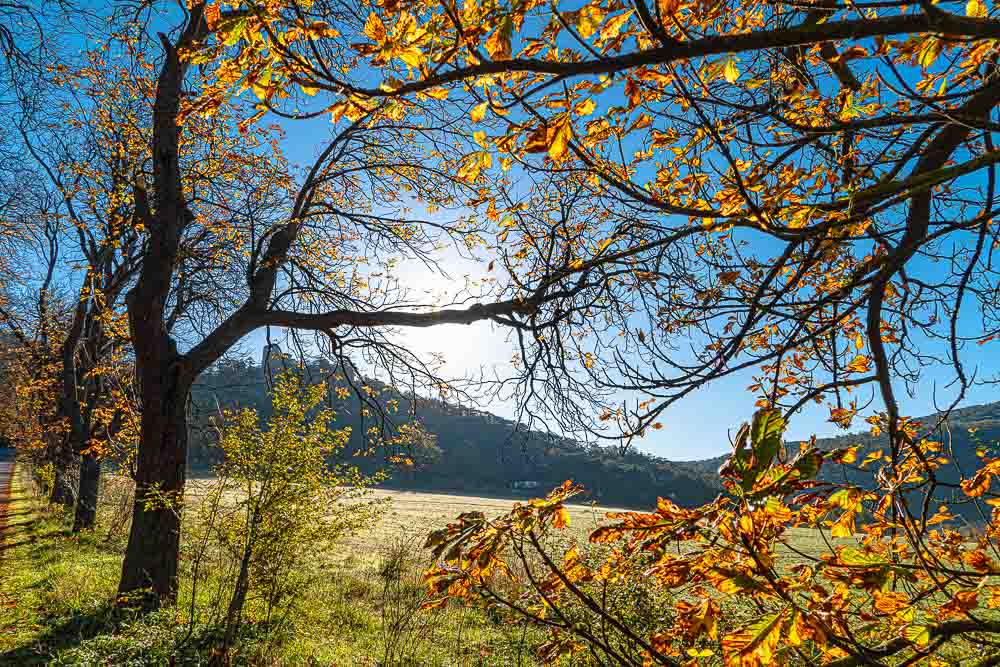 Die Kastanienallee rauf zum Forsthaus Emmerberg hat im Sturm die meisten Blätter verloren, aber die tiefstehende Sonne erzeugt doch schöne Lichteffekte.