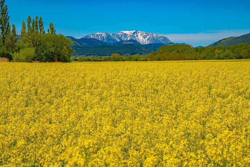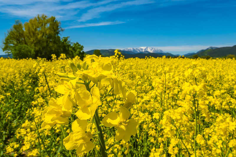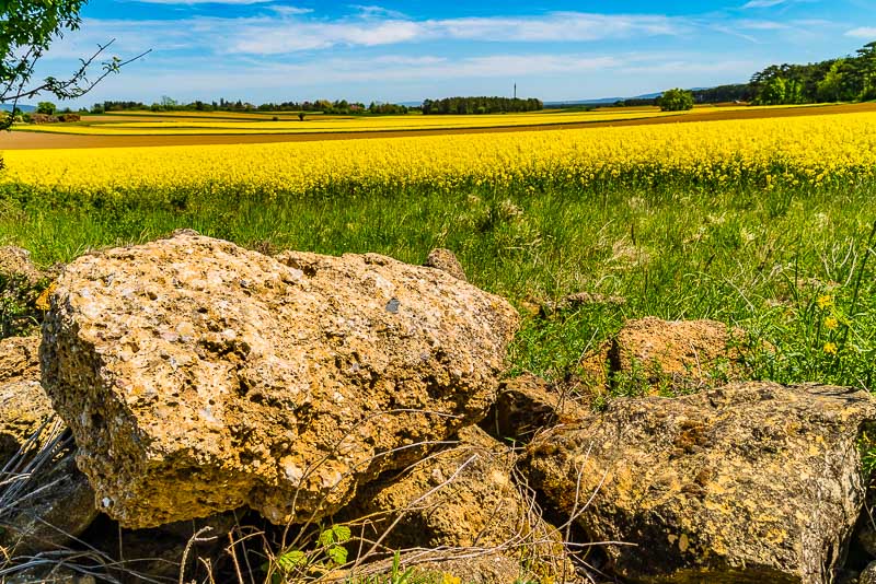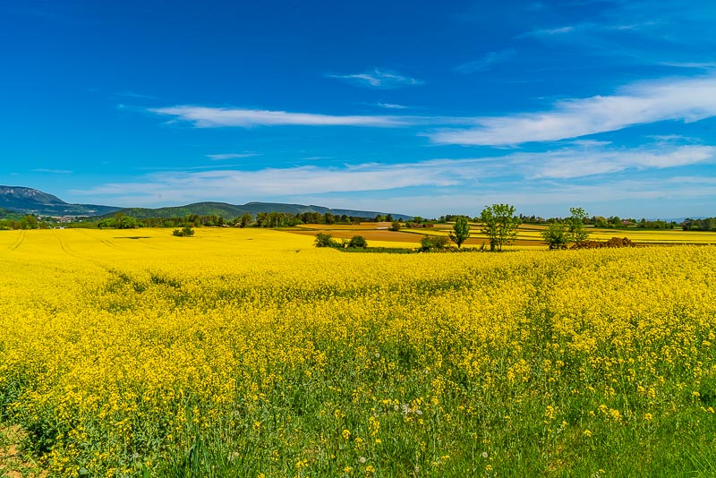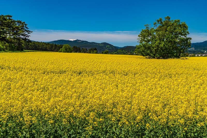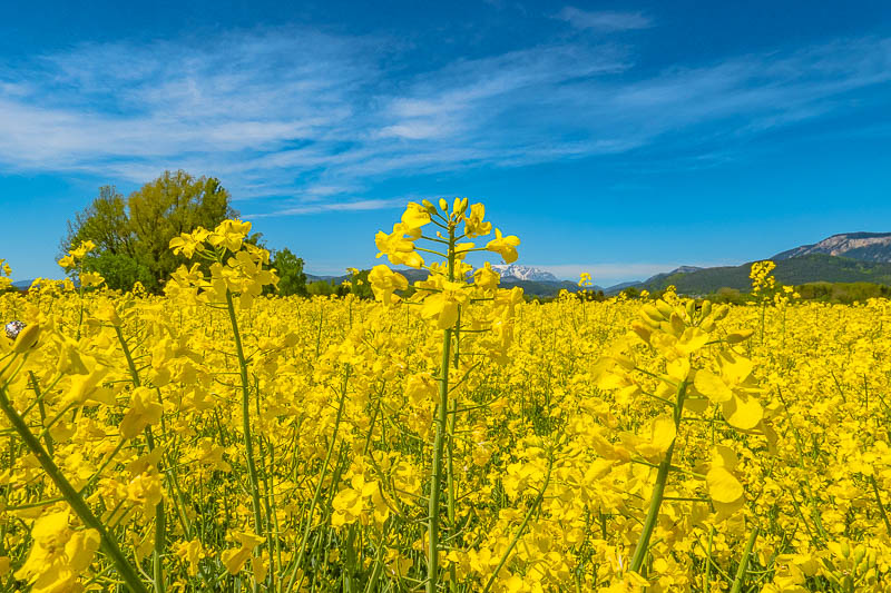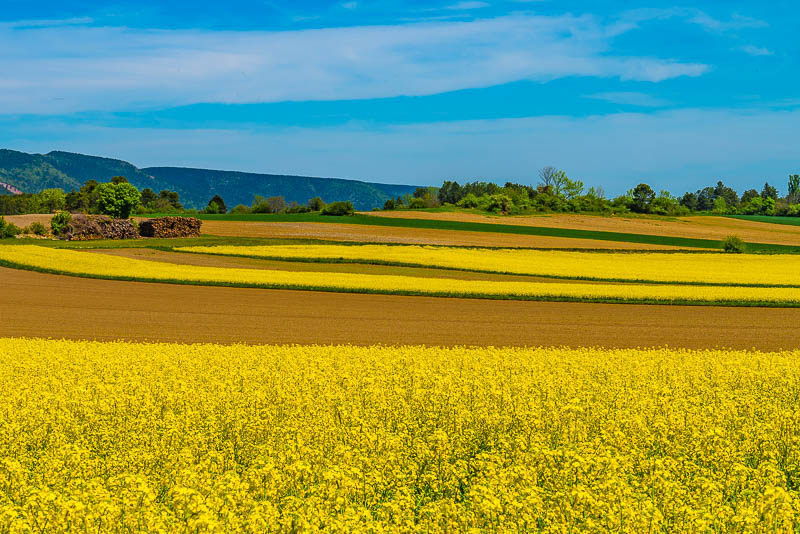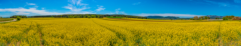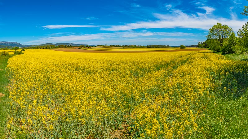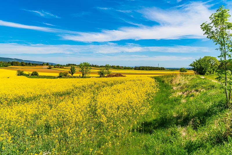 Briht sunshine, up to 28 °C due to a foe weather situation, resulting in excellent visibility. The oilseed rape is in full flower now, so I take my mountain bike to have a look.