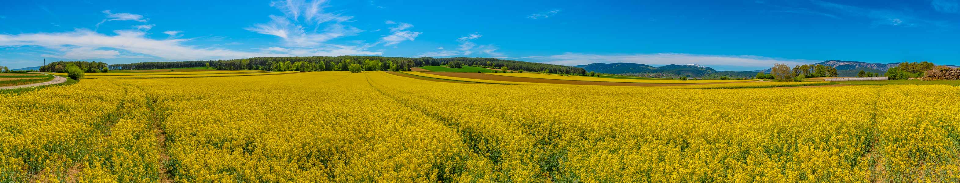 Panoramabild der Rapsfelder zwischen Gerasdorf und Mollram, mit Blick auf die bewaldete Hügelkette Richtung Mollram. Ganz rechts Schneeberg und Hohe Wand.