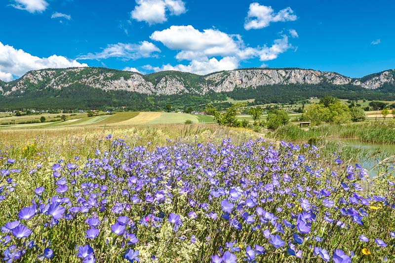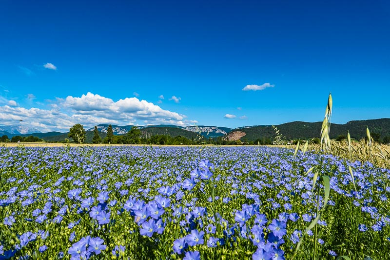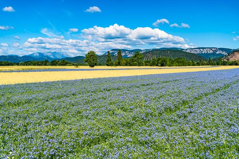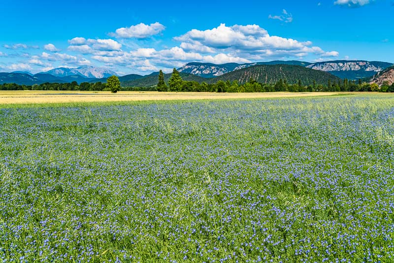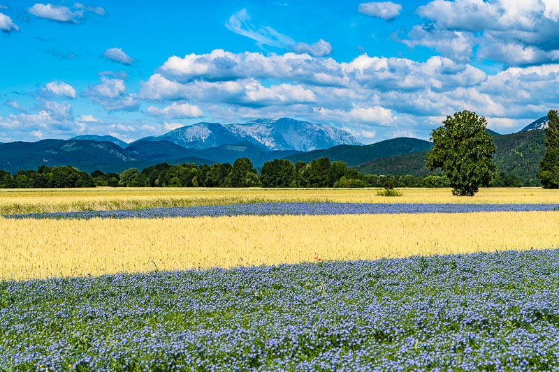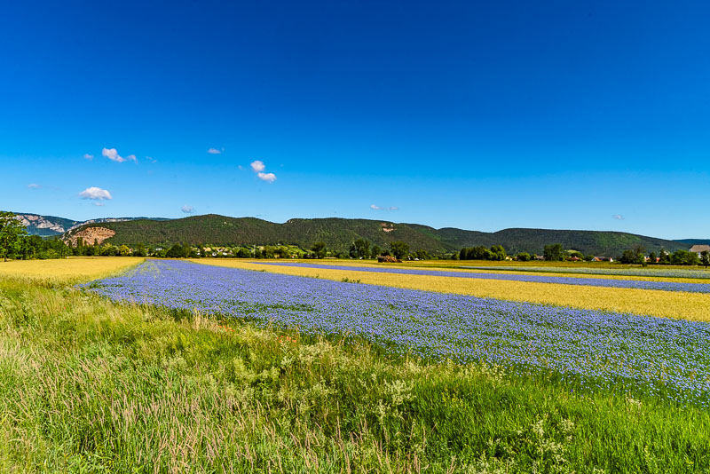 Gleich hinter Weikersdorf treffe ich auf einige blühende Leinfelder.
