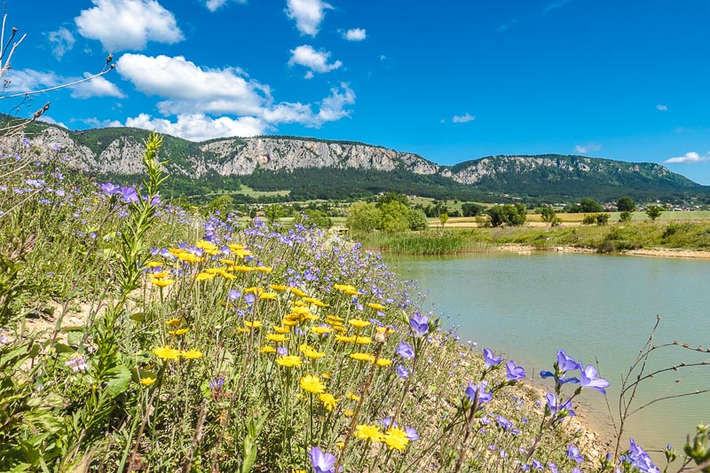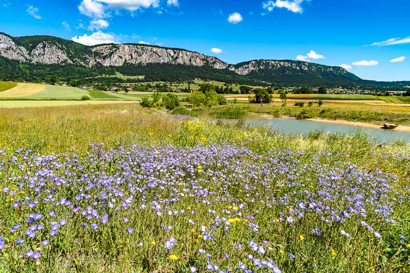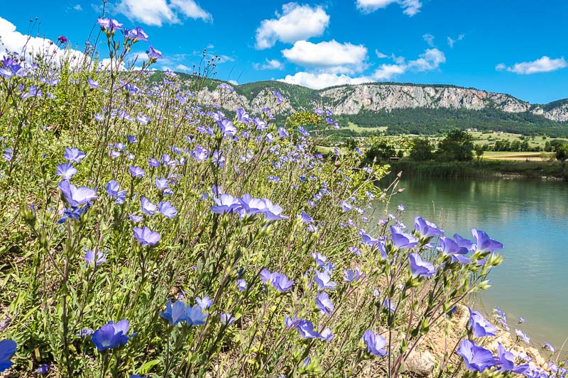 Am Ufer des kleinen Teichs und auf der Wiese daneben blüht der Österreichische Lein (Linum austriacum) in großen Mengen.