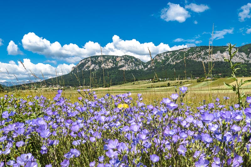 Österreichischer Lein (Linum austriacum) mit Blick auf die Hohe Wand.