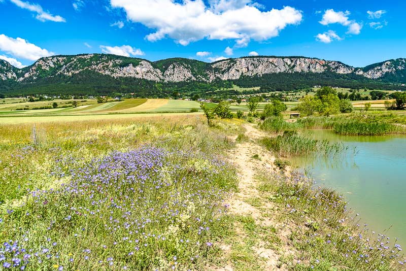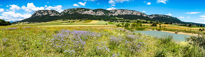 Panorama der Hohen Wand mit dem Teich im Feuchtbiotop Zweiwiese. Hierher oder ins Bild klicken für eine größere Darstellung.