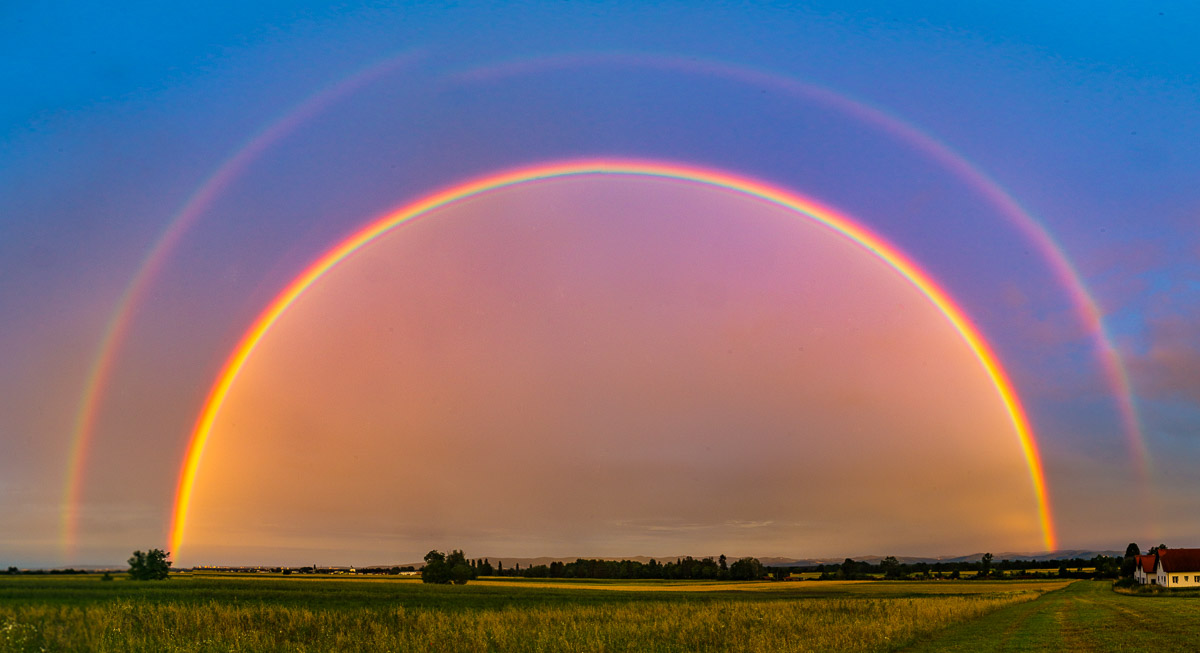 Am nächsten Tag bin ich am frühen Abend bei der Arbeit am Mikroskop, als mich meine Frau ruft, ich soll mal hinausschauen. Zurück, die Kamera geschnappt und an den nahen Ortsrand von Winzendorf gedüst, um diesen Regenbogen zu fotografieren.