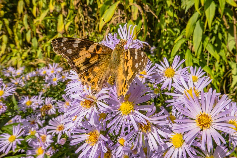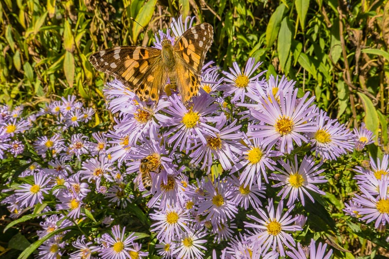 Autumn flowers with visitors - a bee and a silver-washed fritillary - butterfly (Argynnis paphia).