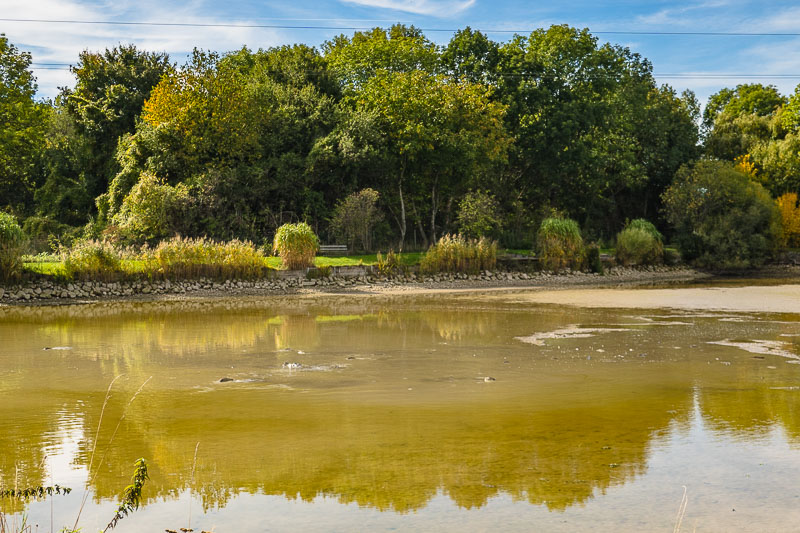 Due to the long dry period this year (starting already in the winter), the "Panorama" - pond is nearly dried out. The carps are already visible near the surface and struggling for their life.