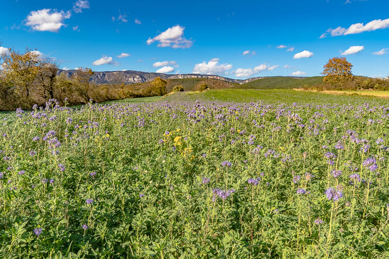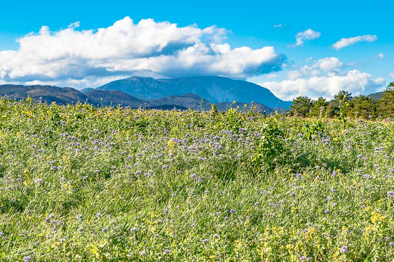 Rainfarn - Phacelie oder Bienenfreund (Phacelia tanacetifolia) und der Blick zur Hohen Wand.