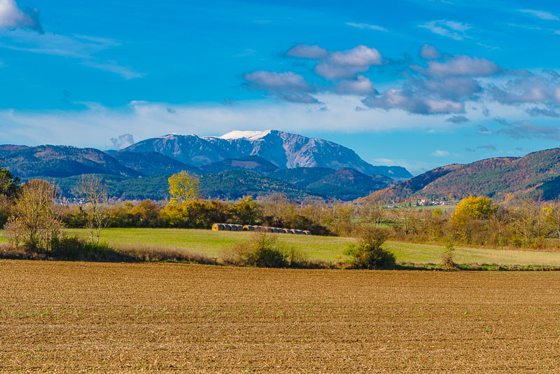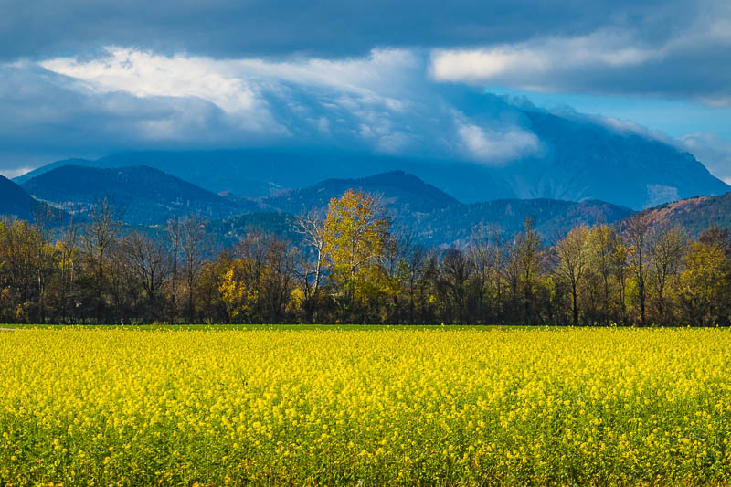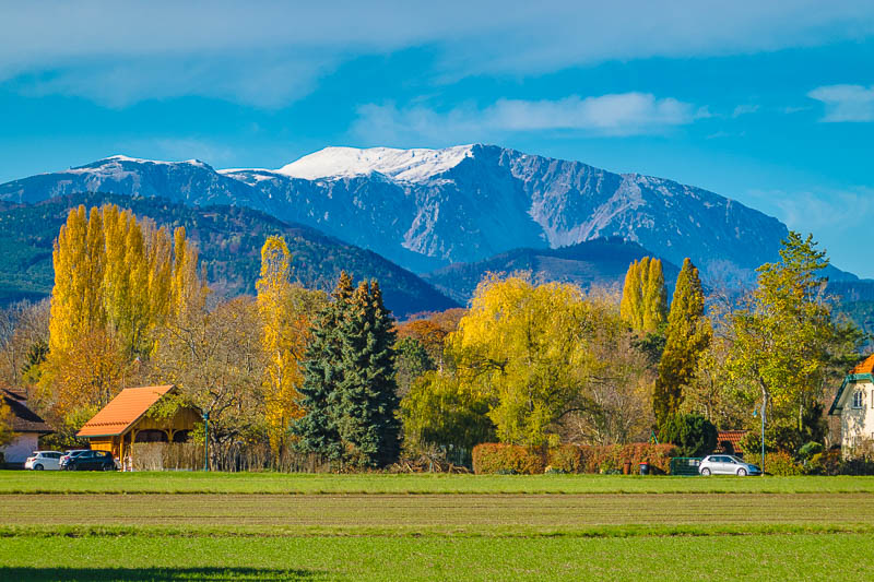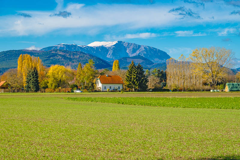 Ein Stück muss ich die Bundesstraße fahren, von hier ein schöner Blick über St. Egyden zum Schneeberg.