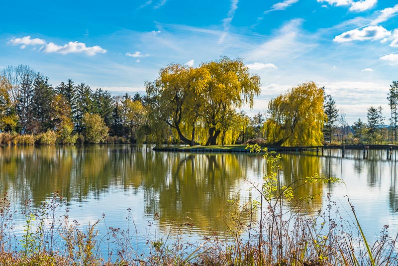 Ich biege wieder rechts ab Richung Strelzhof. Unterwegs komme ich bei wunderschönen Teich vorbei. Da hier der Zubringer vom Johannesbach zum Frauenbach vorbeifließt, nehme ich an, dass deswegen genug Wasser im Teich ist, im Gegensatz zum Panoramateich, der vom ausgetrockneten Moribach gespeist und ebenfalls ausgetrocnet ist.