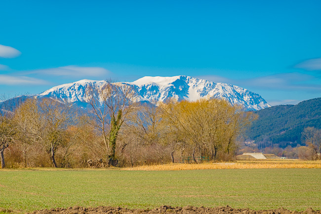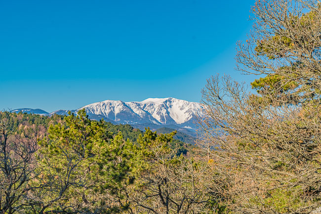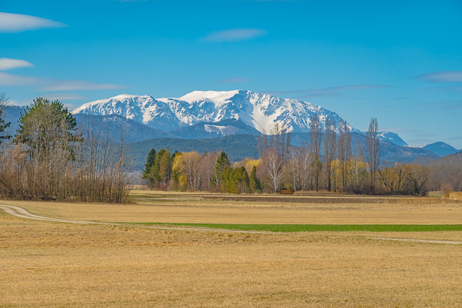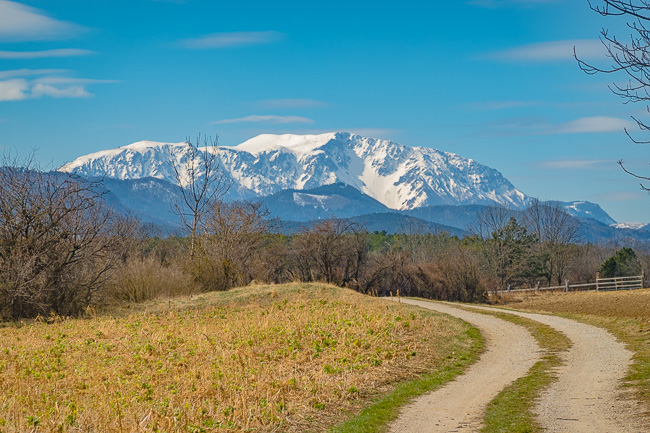 First glimpse of Schneeberg between the trees of the forest steppe.
