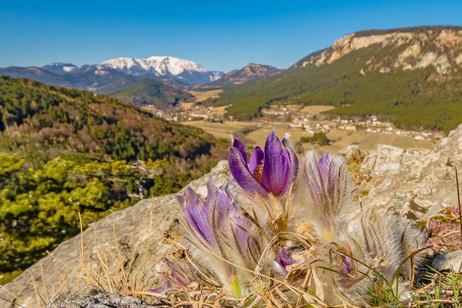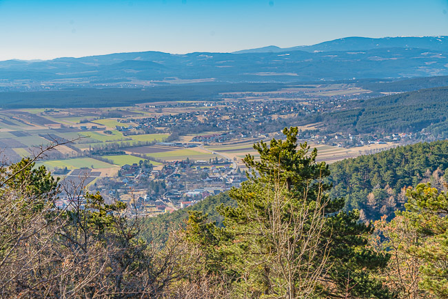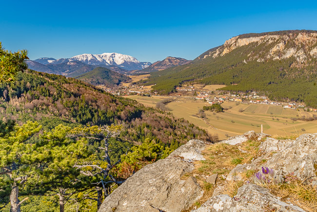 Enjoying the panoramic view from the rock shortly beneath the summit, to Schneeberg and Hohe Wand. Click here or into the picture for a larger display.