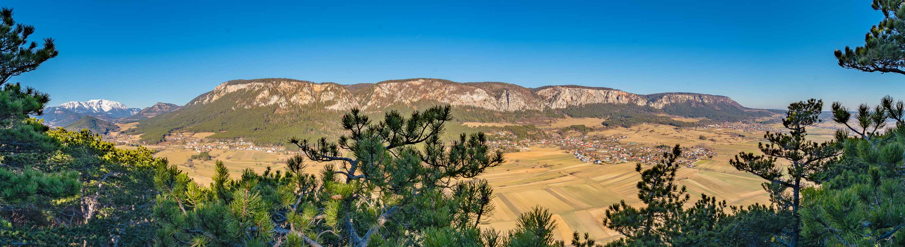 Von der Feldkanzel knapp unterhalb des Gipfels genieße ich den Panoramablick zu Schneeberg und Hoher Wand.